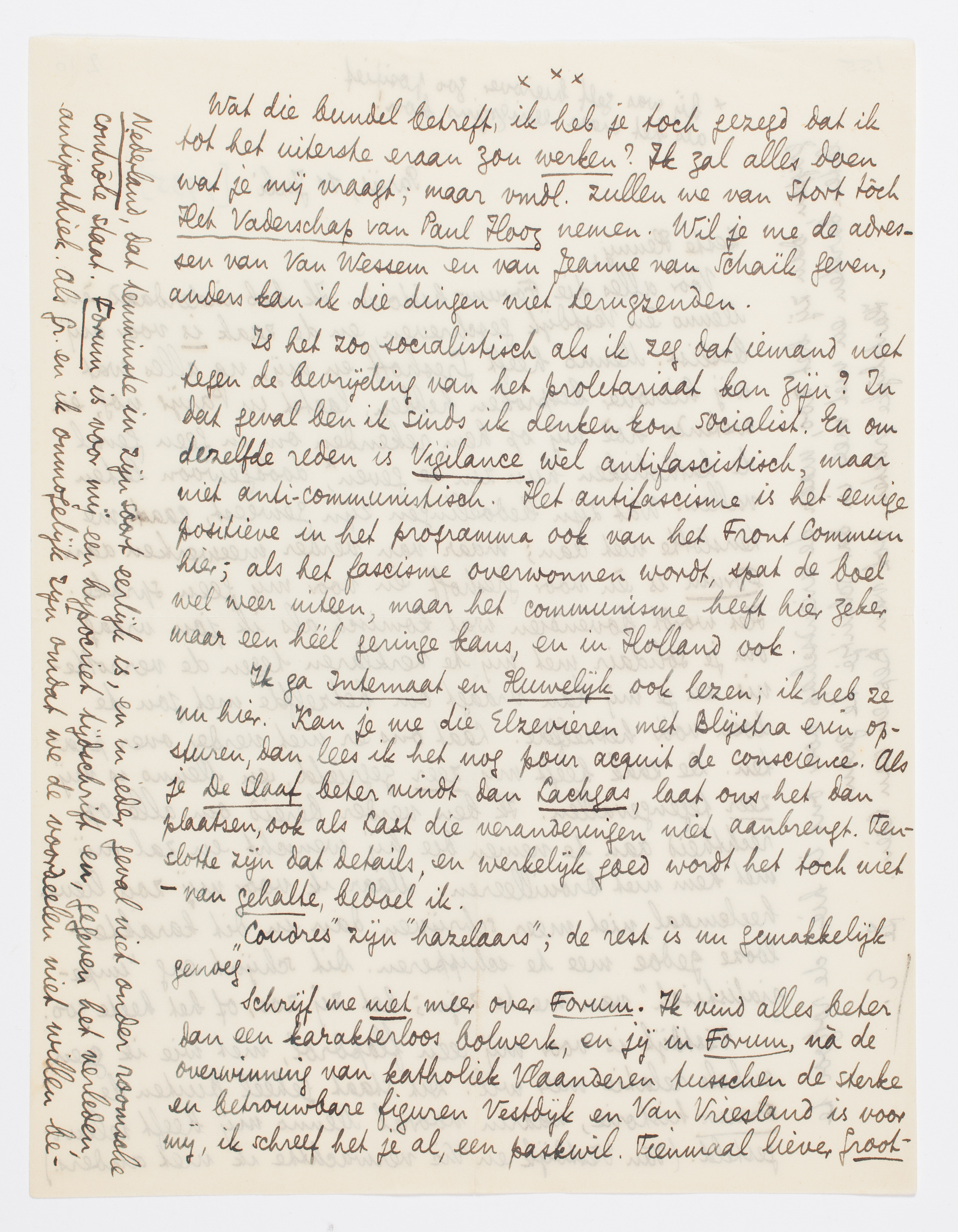 Vóór alles die Forum-historie. Ik heb inderdaad èn Menno èn Vestdijk geschreven, en de zaak is voor mij beslist. Menno heeft Greshoff en mij, na alles wat wij hierover besproken hebben, laatst in Parijs nog, en wetende hoè wij op hem rekenden om in geen geval de katholieken hun zin te geven,* doodgewoon laten vallen. Wat zijn bedoelingen zijn geweest, gaat me tenslotte niet aan; maar van verder meewerken aan Forum is èn voor Greshoff èn voor mij geen sprake. Het wordt bovendien wat komisch als ik jou vraag om je solidair met mij te verklaren tegen de verrottenis en je mij dan vraagt om hetzelfde met jou te doen vóór hetzelfde. Laat ons er niet verder over praten. De zaak heeft mij zeer gegriefd, en Menno is mij zeer tegengevallen. Ik ben verder bereid om alle oprechtheid aan te nemen die hij wenscht en zal mij met hem niet brouilleeren. Maar ik voor mij zou liever heelemaal niet meer schrijven dan in dit karakterlooze gedoe mee te schipperen. Dit schijnt erg ‘imperialistisch’ van me te zijn; het zij zoo, of het heete zoo.