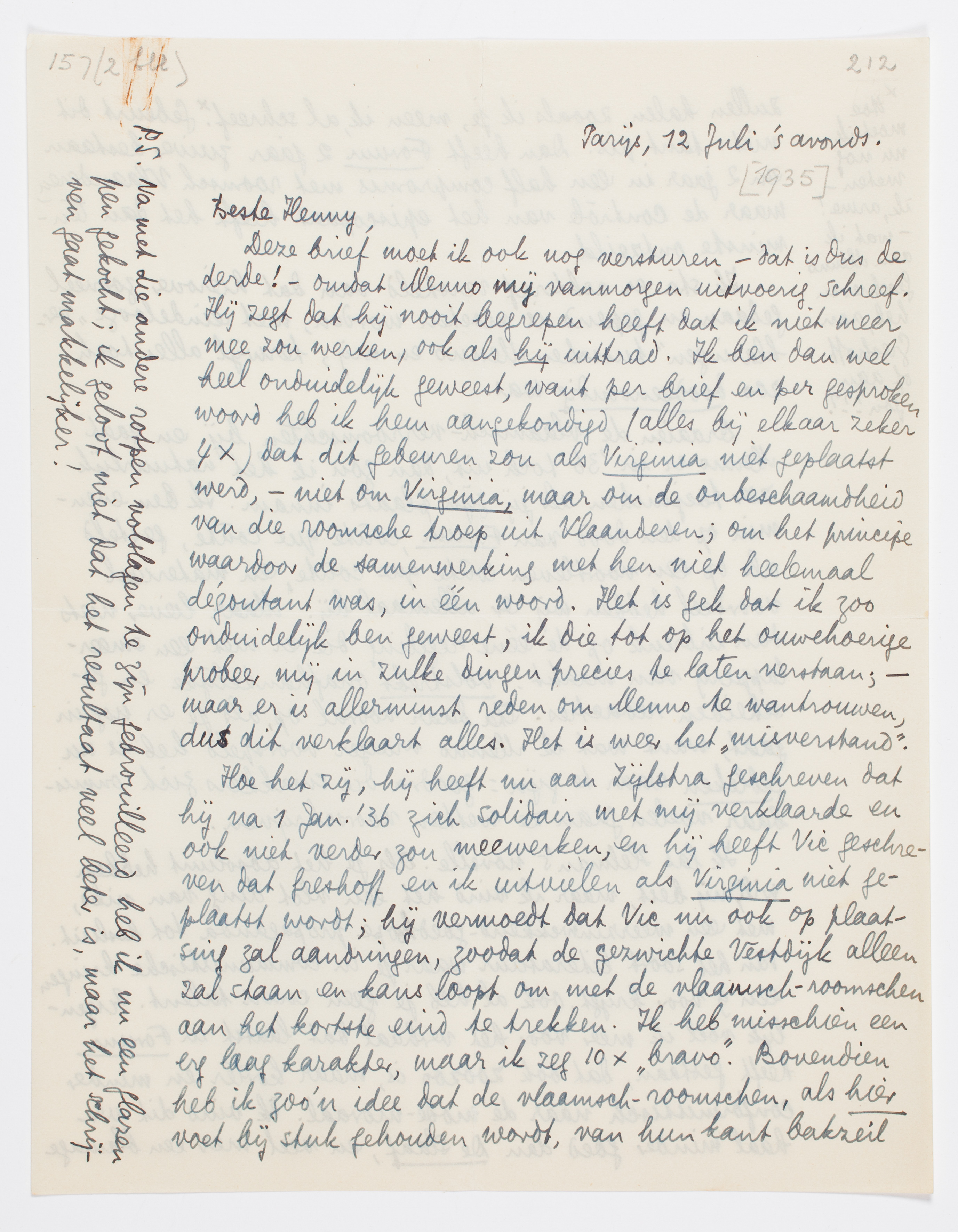 Hoe het zij, hij heeft nu aan Zijlstra geschreven dat hij na 1 Jan. '36 zich solidair met mij verklaarde en ook niet verder zou meewerken, en hij heeft Vic geschreven dat Greshoff en ik uitvielen als Virginia niet geplaatst wordt; hij vermoedt dat Vic nu ook op plaatsing zal aandringen, zoodat de gezwichte Vestdijk alleen zal staan en kans loopt om met de vlaamsch-roomschen aan het kortste eind te trekken. Ik heb misschien een erg laag karakter, maar ik zeg 10 × ‘bravo’. Bovendien heb ik zoo'n idee dat de vlaamsch-roomschen, als hier voet bij stuk gehouden wordt, van hun kant bakzeil zullen halen, zooals ik je, meen ik, al schreef.* Gebeurt dit niet: tant pis. Dan heeft Forum 2 jaar zuiver bestaan en 2 jaar in een half compromis met roomsch Vlaanderen, maar de contrôle van het episcopaat heeft het dan tenminste ontzeild.