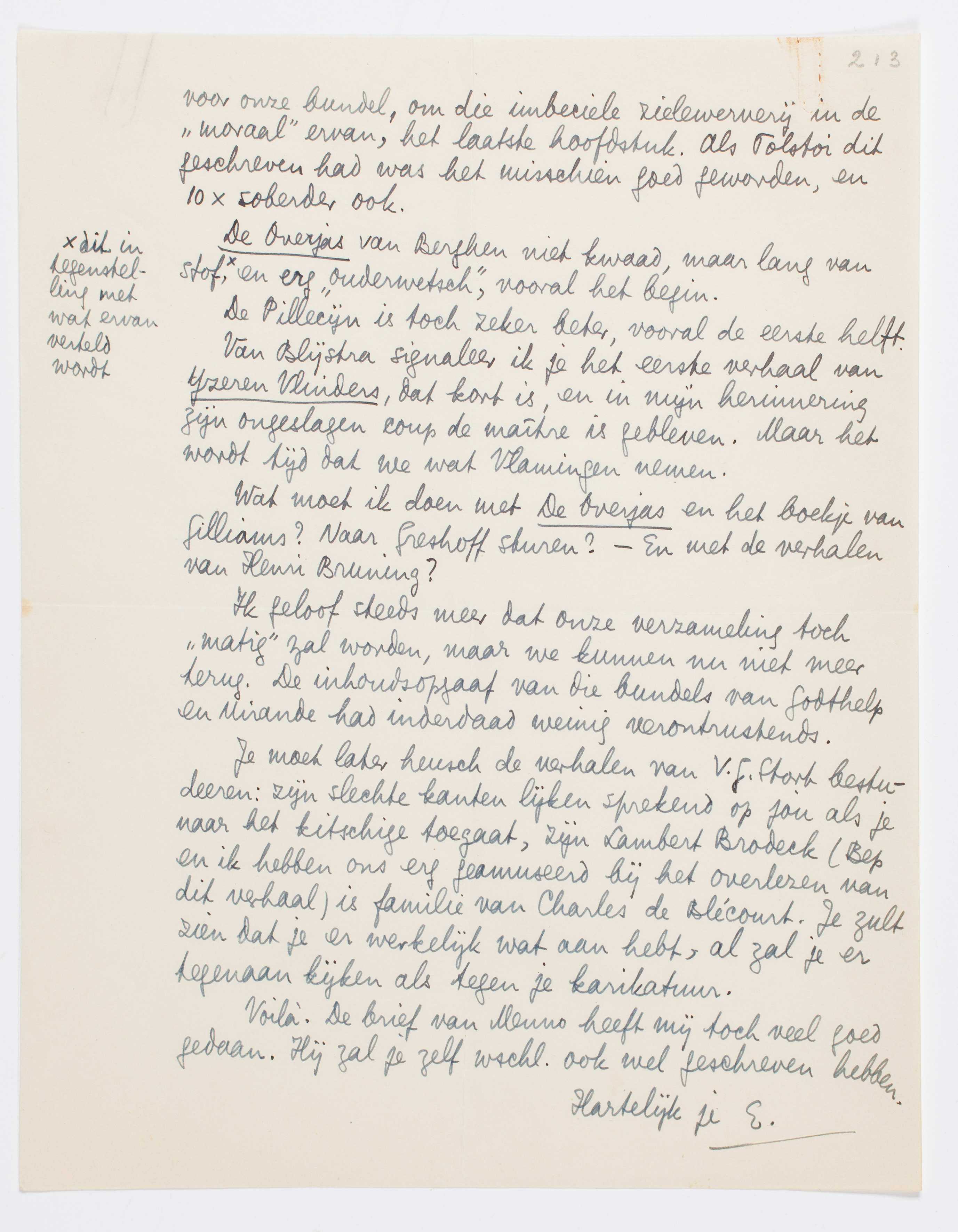 Ik las Helman's novelle. Als je het absoluut hebben wilt, mij best, maar ik vind het een vlot ding van niks, met een weerzinwekkend-goedkoope propaganda tot besluit. Van het soort literatuur waar je in communistische kringen een 9 voor krijgt, ook al heb je geen snars talent. Eigenlijk voel ik meer voor het verhaal dat laatst in Forum heeft gestaan, dat ook zoozoo is, maar korter en minder conformistisch naar de mode-moraal.3814 Ik vind dit verhaal minder goed dan De Slaaf, en veel meer een blamage voor onze bundel, om die imbeciele zielewerverij in de ‘moraal’ ervan, het laatste hoofdstuk. Als Tolstoi dit geschreven had was het misschien goed geworden, en 10 × soberder ook.