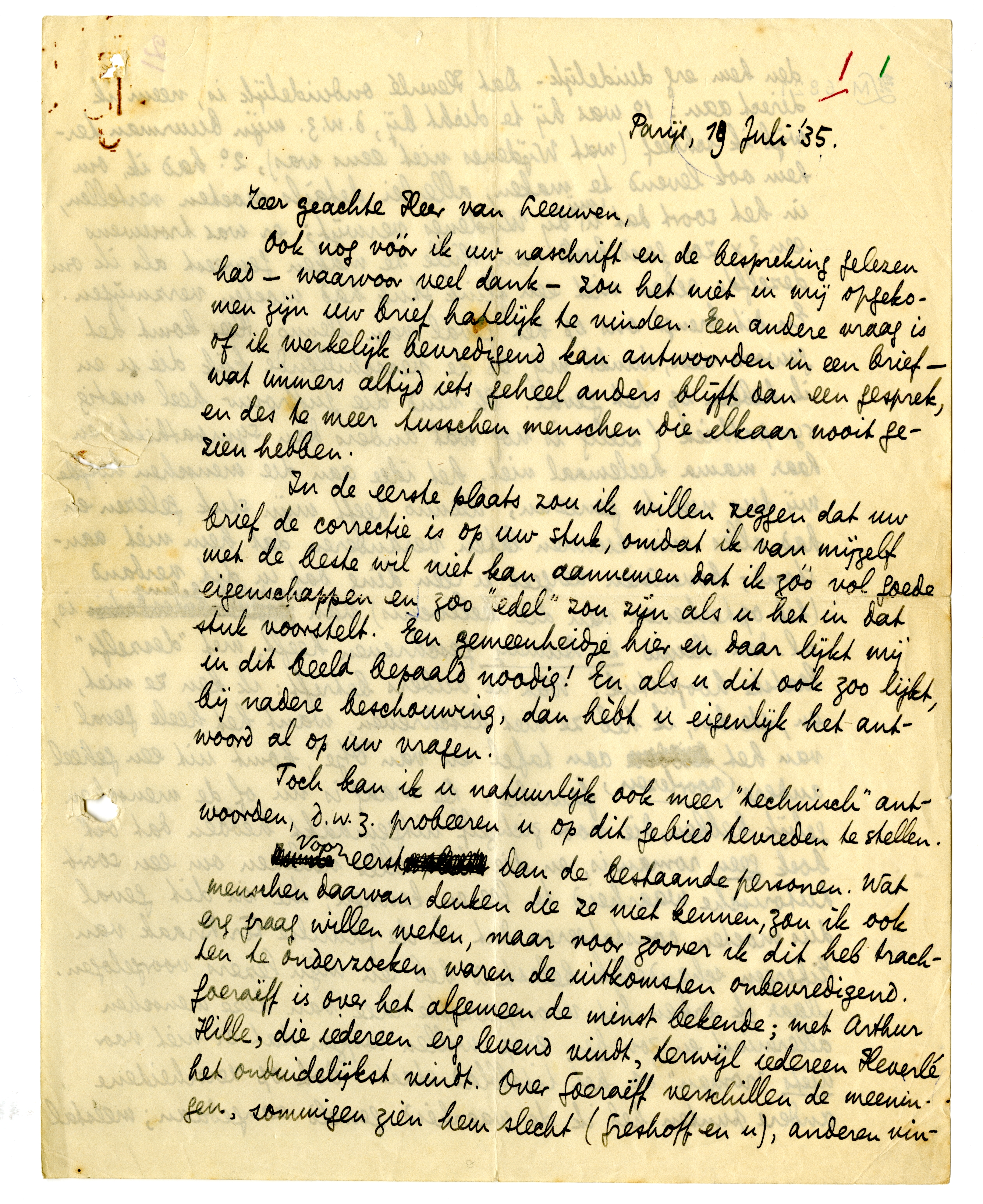 In de eerste plaats zou ik willen zeggen dat uw brief de correctie is op uw stuk, omdat ik van mijzelf met de beste wil niet kan aannemen dat ik zóó vol goede eigenschappen en zoo ‘edel’ zou zijn als u het in dat stuk voorstelt. Een gemeenheidje hier en daar lijkt mij in dit beeld bepaald noodig! En als u dit ook zoo lijkt, bij nadere beschouwing, dan hèbt u eigenlijk het antwoord al op uw vragen.