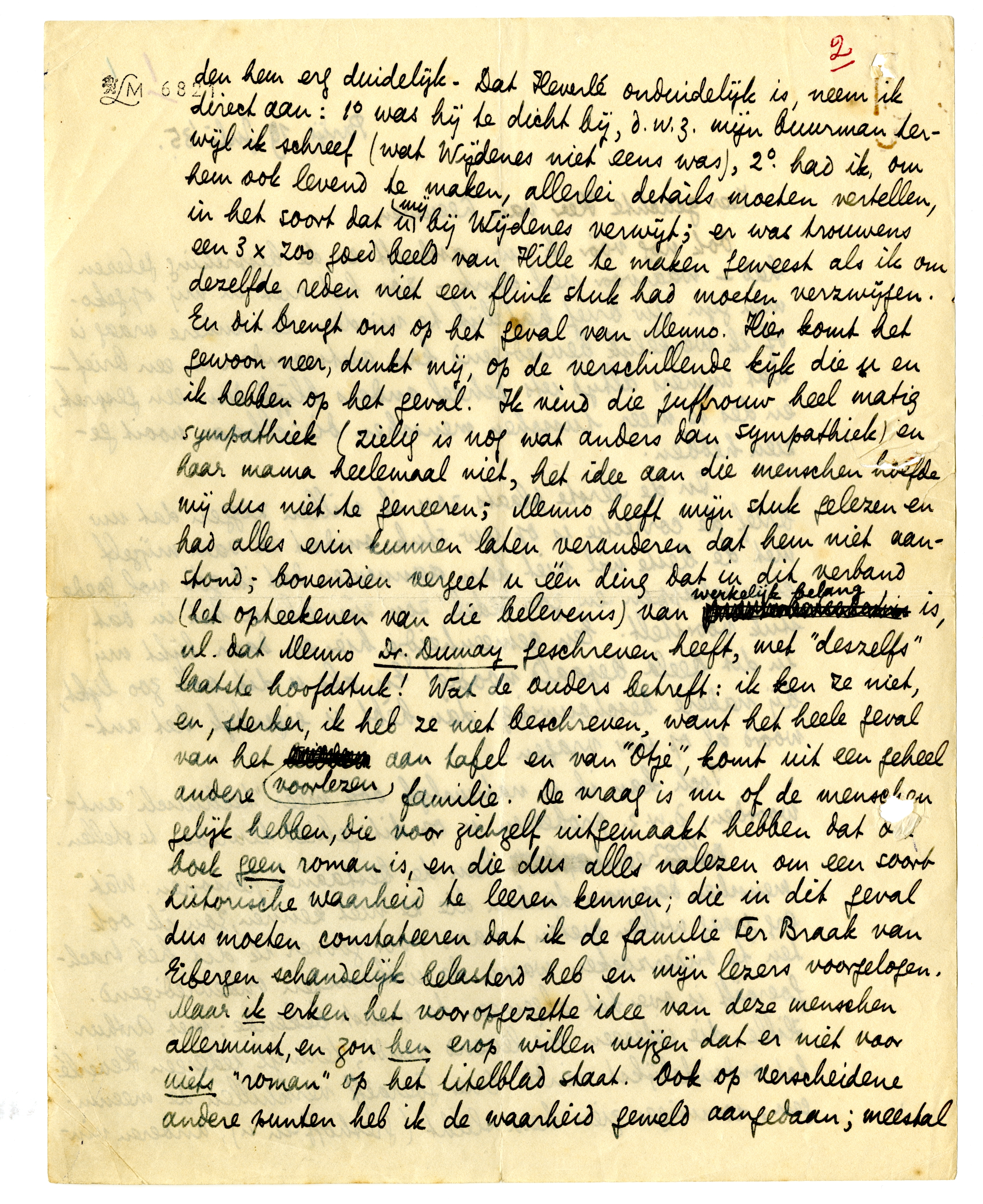 Vooreerst dan de bestaande personen. Wat menschen daarvan denken die ze niet kennen, zou ik ook erg graag willen weten, maar voor zoover ik dit heb trachten te onderzoeken waren de uitkomsten onbevredigend. Goeraëff is over het algemeen de minst bekende; met Arthur Hille, die iedereen erg levend vindt, terwijl iedereen Heverlé het onduidelijkst vindt. Over Goeraëff verschillen de meeningen, sommigen zien hem slecht (Greshoff en u), anderen vinden hem erg duidelijk. Dat Heverlé onduidelijk is, neem ik direct aan: 1o was hij te dicht bij, d.w.z. mijn buurman terwijl ik schreef (wat Wijdenes niet eens was), 2o had ik, om hem ook levend te maken, allerlei details moeten vertellen, in het soort dat u mij bij Wijdenes verwijt; er was trouwens een 3 × zoo goed beeld van Hille te maken geweest als ik om dezelfde reden niet een flink stuk had moeten verzwijgen. En dit brengt ons op het geval van Menno. Hier komt het gewoon neer, dunkt mij, op de verschillende kijk die u en ik hebben op het geval. Ik vind die juffrouw heel matig sympathiek (zielig is nog wat anders dan sympathiek) en haar mama heelemaal niet, het idee aan die menschen hoefde mij dus niet te geneeren; Menno heeft mijn stuk gelezen en had alles erin kunnen laten veranderen dat hem niet aanstond; bovendien vergeet u één ding dat in dit verband (het opteekenen van die belevenis) van werkelijk belang is, nl. dat Menno Dr. Dumay geschreven heeft, met ‘deszelfs’ laatste hoofdstuk! Wat de ouders betreft: ik ken ze niet, en, sterker, ik heb ze niet beschreven, want het heele geval van het voorlezen aan tafel en van ‘Otje’, komt uit een geheel andere familie. De vraag is nu of de menschen gelijk hebben, die voor zichzelf uitgemaakt hebben dat dit boek geen roman is, en die dus alles nalezen om een soort historische waarheid te leeren kennen; die in dit geval dus moeten constateeren dat ik de familie Ter Braak van Eibergen schandelijk belasterd heb en mijn lezers voorgelogen. Maar ik erken het vooropgezette idee van deze menschen allerminst, en zou hen erop willen wijzen dat er niet voor niets ‘roman’ op het titelblad staat. Ook op verscheidene andere punten heb ik de waarheid geweld aangedaan; meestal om redenen die u zou bijvallen. U ziet dus dat het een kwestie wordt van het eene nog te gebruiken en het andere niet meer. Ik bedoel volstrekt niet dat alles wat er nu in het boek staat geen aanstoot zal geven aan de betrokken personen; maar ik heb overal de grenzen daar getrokken waar ik het voor mijn eigen gevoel kon verantwoorden. Ik heb altijd een stevige minachting gehad voor wat ‘men’ ervan zeggen zou, maar zonder dat, of zelfs als ik een ‘delicater’, ‘schroomvalliger’ natuur had gehad, zou ik het heele boek niet geschreven hebben. Zoodat de laatste wijsheid deze wordt, dunkt mij: dat je iemand, wiens temperament hem drijft tot het schrijven van bekentenisliteratuur, niet vragen kunt dezelfde eerlijkheid en kieschheid te hebben van iemand die zelfs zijn eigen ondervinding legt in een boek als bv. Niels Lyhne (of Malte Laurids Brigge). Het wordt een kwestie van grenzen.