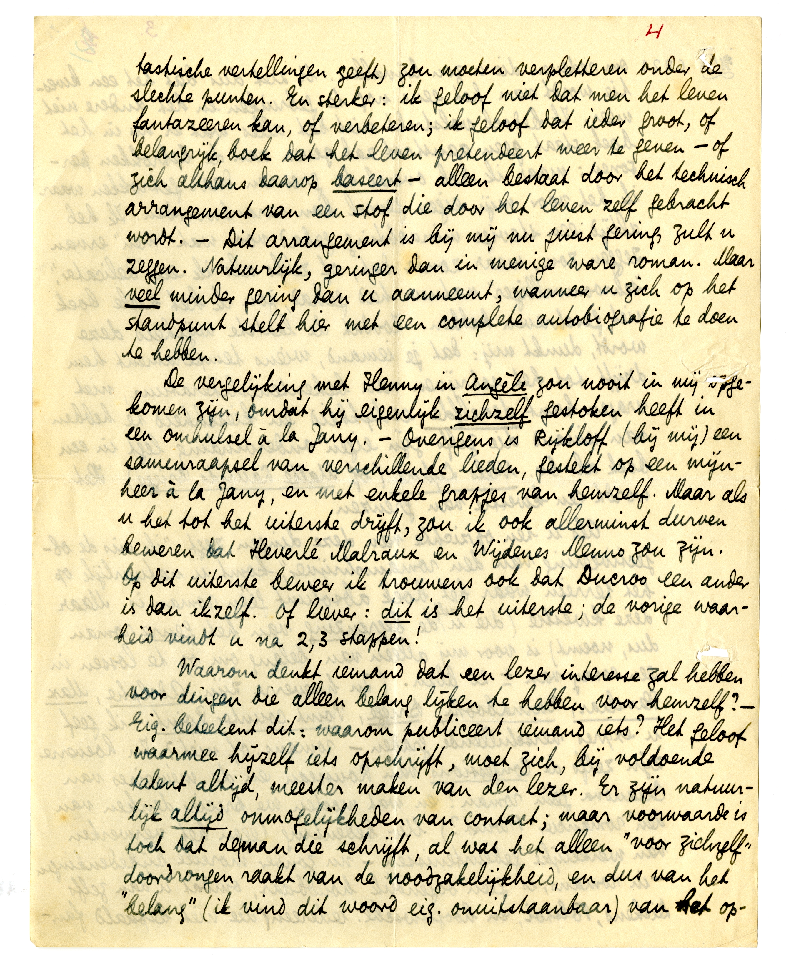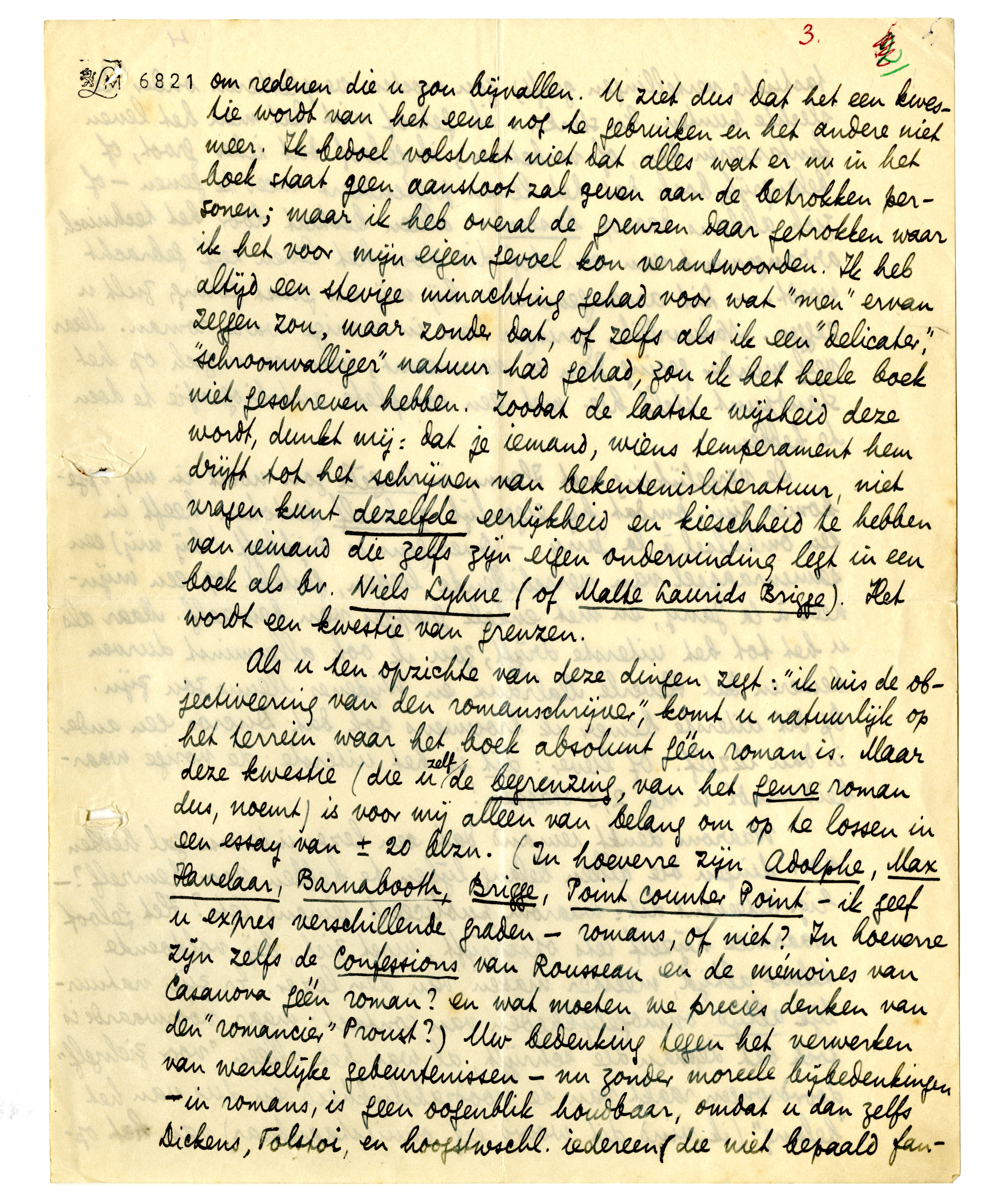 Als u ten opzichte van deze dingen zegt: ‘ik mis de objectiveering van den romanschrijver’, komt u natuurlijk op het terrein waar het boek absoluut géén roman is. Maar deze kwestie (die u zelf de begrenzing, van het genre roman dus, noemt) is voor mij alleen van belang om op te lossen in een essay van ± 20 blzn. (In hoeverre zijn Adolphe, Max Havelaar, Barnabooth, Brigge, Point counter Point - ik geef u expres verschillende graden - romans, of niet? In hoeverre zijn zelfs de Confessions van Rousseau en de mémoires van Casanova géén roman? en wat moeten we precies denken van den ‘romancier’ Proust?) Uw bedenking tegen het verwerken van werkelijke gebeurtenissen - nu zonder moreele bijbedenkingen - in romans, is geen oogenblik houdbaar, omdat u dan zelfs Dickens, Tolstoi, en hoogstwschl. iedereen (die niet bepaald fantastische vertellingen geeft) zou moeten verpletteren onder de slechte punten. En sterker: ik geloof niet dat men het leven fantazeeren kan, of verbeteren; ik geloof dat ieder groot, of belangrijk, boek dat het leven pretendeert weer te geven - of zich althans daarop baseert - alleen bestaat door het technisch arrangement van een stof die door het leven zelf gebracht wordt. - Dit arrangement is bij mij nu juist gering, zult u zeggen. Natuurlijk, geringer dan in menige ware roman. Maar veel minder gering dan u aanneemt, wanneer u zich op het standpunt stelt hier met een complete autobiografie te doen te hebben.