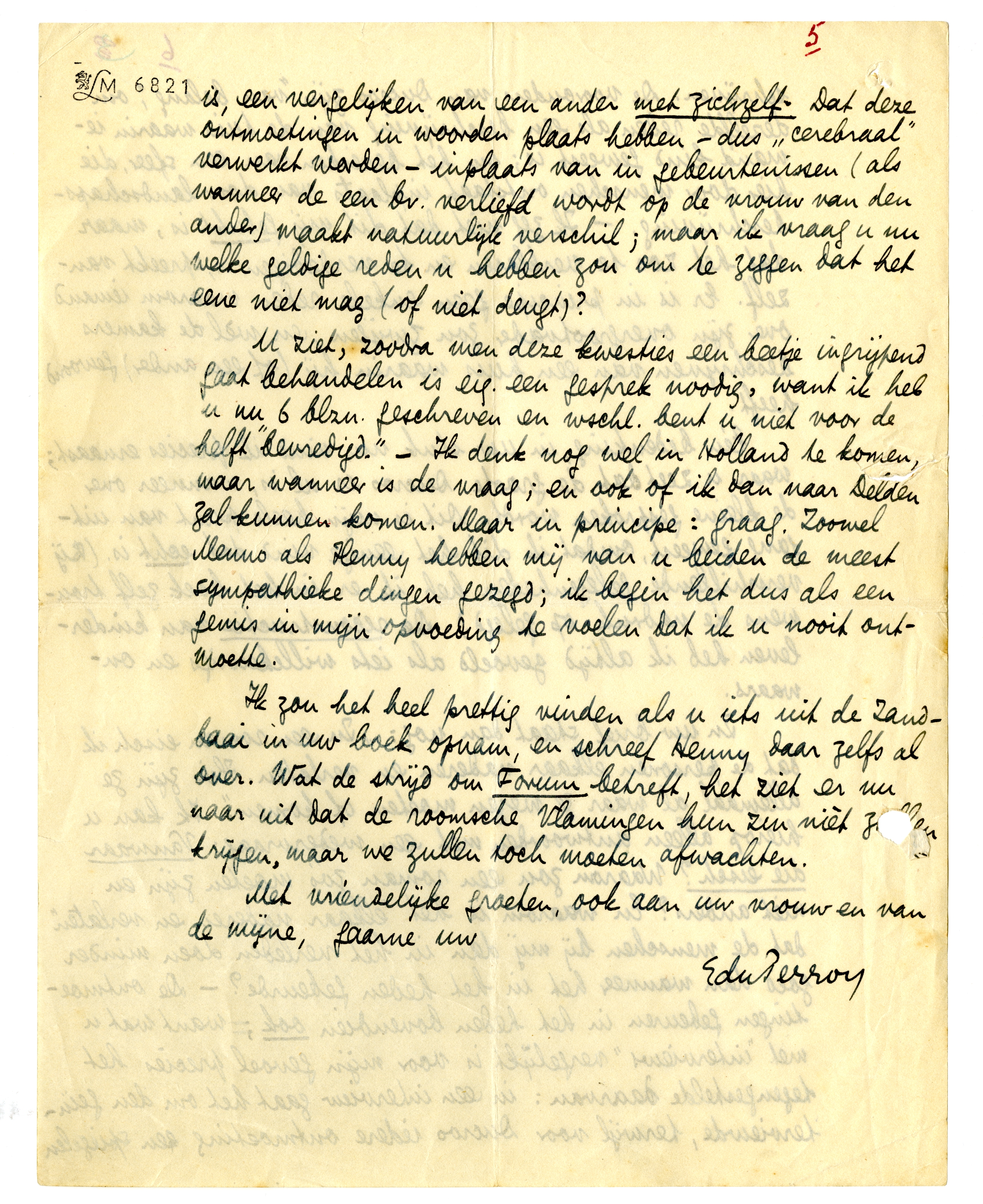 In uw brief staat dan nog: ‘In een roman eisch ik dat de personen elkaar naderen en verlaten. Hier zijn ze allemaal al waar ze wezen moeten of komen’. Ik kan u hierop alleen antwoorden met een wedervraag: Vanwaar die eisch? Waarom zou een roman zóó moeten zijn en niet anders? En waarom is het ‘elkaar naderen en verlaten’ dat de menschen bij mij dan in het verleden doen minder goed dan wanneer het in het heden gebeurde? - De ontmoetingen gebeuren in het heden bovendien ook; want wat u met ‘interviews’ vergelijkt is voor mijn gevoel precies het tegengestelde daarvan: in een interview gaat het om den geïnterviewde, terwijl voor Ducroo iedere ontmoeting een spiegelen is, een vergelijken van een ander met zichzelf. Dat deze ontmoetingen in woorden plaats hebben - dus ‘cerebraal’ verwerkt worden - inplaats van in gebeurtenissen (als wanneer de een bv. verliefd wordt op de vrouw van den ander) maakt natuurlijk verschil; maar ik vraag u nu welke geldige reden u hebben zou om te zeggen dat het eene niet mag (of niet deugt)?