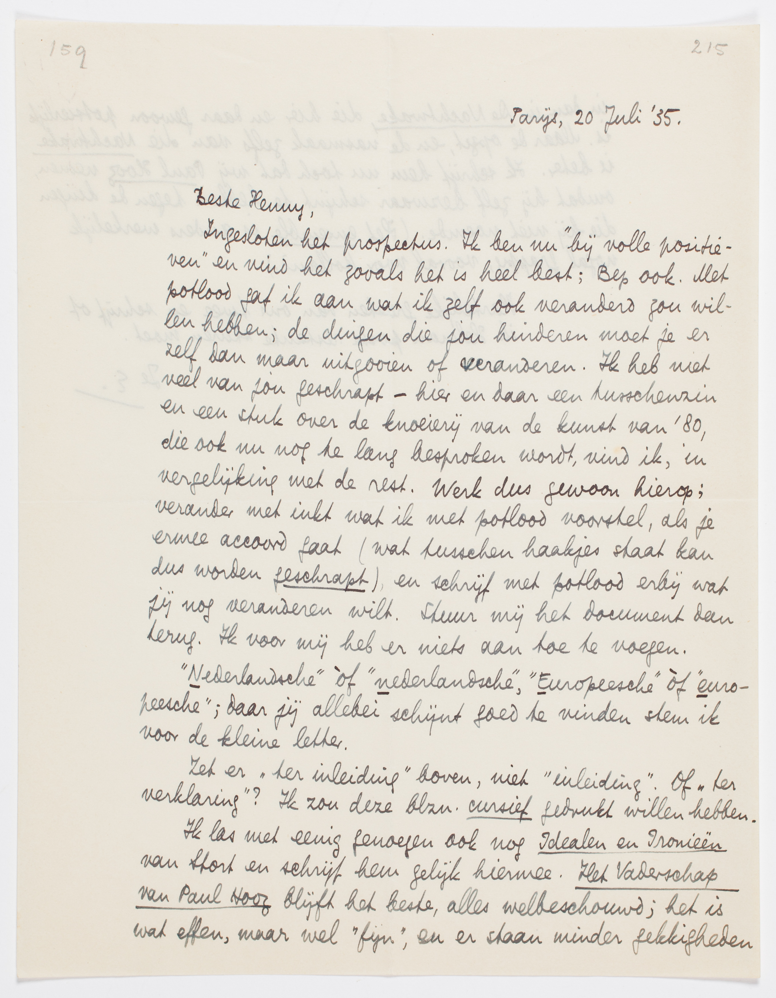 Ingesloten het prospectus. Ik ben nu ‘bij volle positieven’ en vind het zooals het is heel best; Bep ook. Met potlood gaf ik aan wat ik zelf ook veranderd zou willen hebben; de dingen die jou hinderen moet je er zelf dan maar uitgooien of veranderen. Ik heb niet veel van jou geschrapt - hier en daar een tusschenzin en een stuk over de knoeierij van de kunst van '80, die ook nu nog te lang besproken wordt, vind ik, in vergelijking met de rest. Werk dus gewoon hierop; verander met inkt wat ik met potlood voorstel, als je ermee accoord gaat (wat tusschen haakjes staat kan dus worden geschrapt), en schrijf met potlood erbij wat jij nog veranderen wilt. Stuur mij het document dan terug. Ik voor mij heb er niets aan toe te voegen.