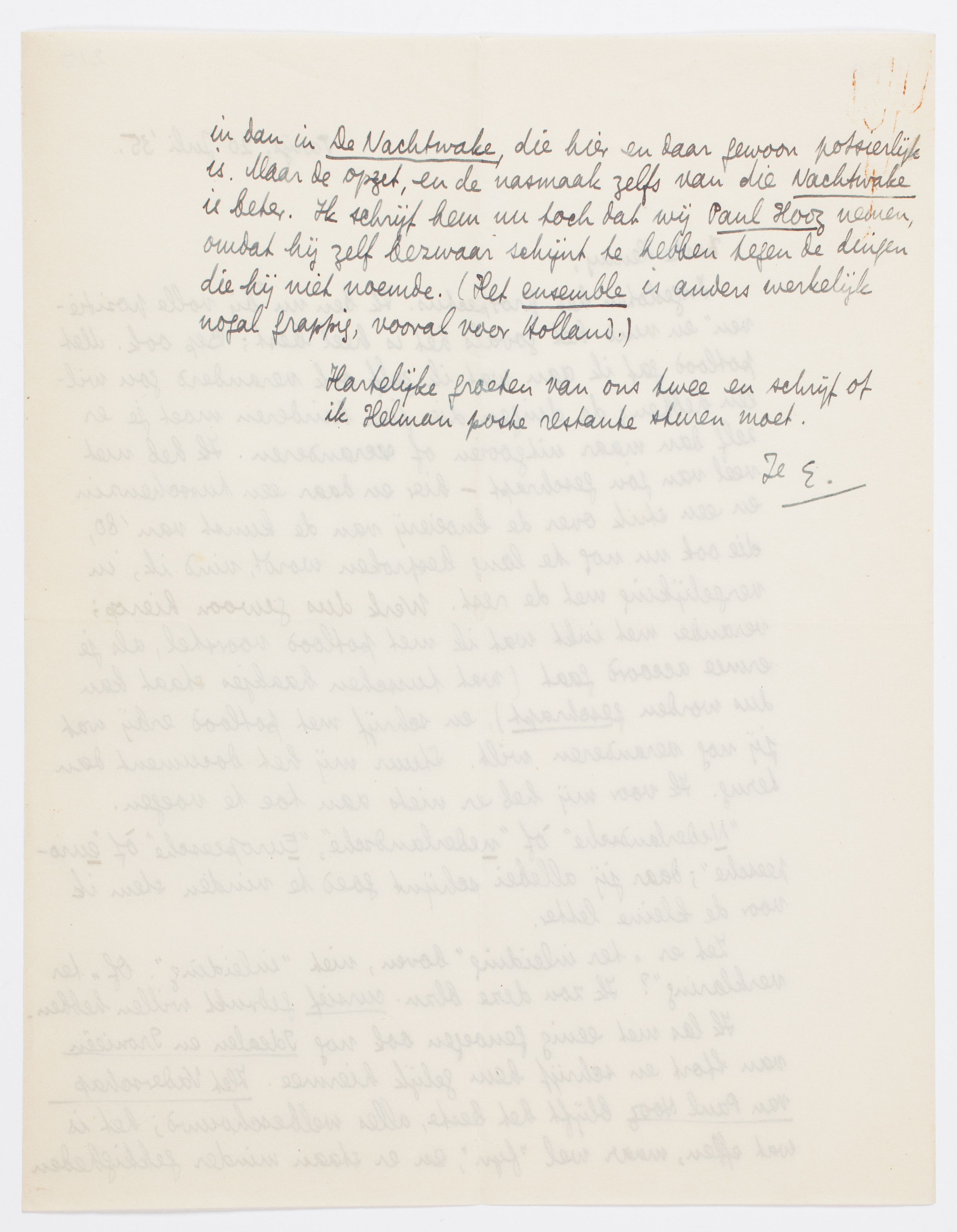 Ik las met eenig genoegen ook nog Idealen en Ironieën van Stort en schrijf hem gelijk hiermee.3823 Het vaderschap van Paul Hooz blijft het beste, alles welbeschouwd; het is wat effen, maar wel ‘fijn’, en er staan minder gekkigheden in dan in De Nachtwake, die hier en daar gewoon potsierlijk is. Maar de opzet, en de nasmaak zelfs van die Nachtwake is beter. Ik schrijf hem nu toch dat wij Paul Hooz nemen, omdat hij zelf bezwaar schijnt te hebben tegen de dingen die hij niet noemde. (Het ensemble is anders werkelijk nogal grappig, vooral voor Holland.)