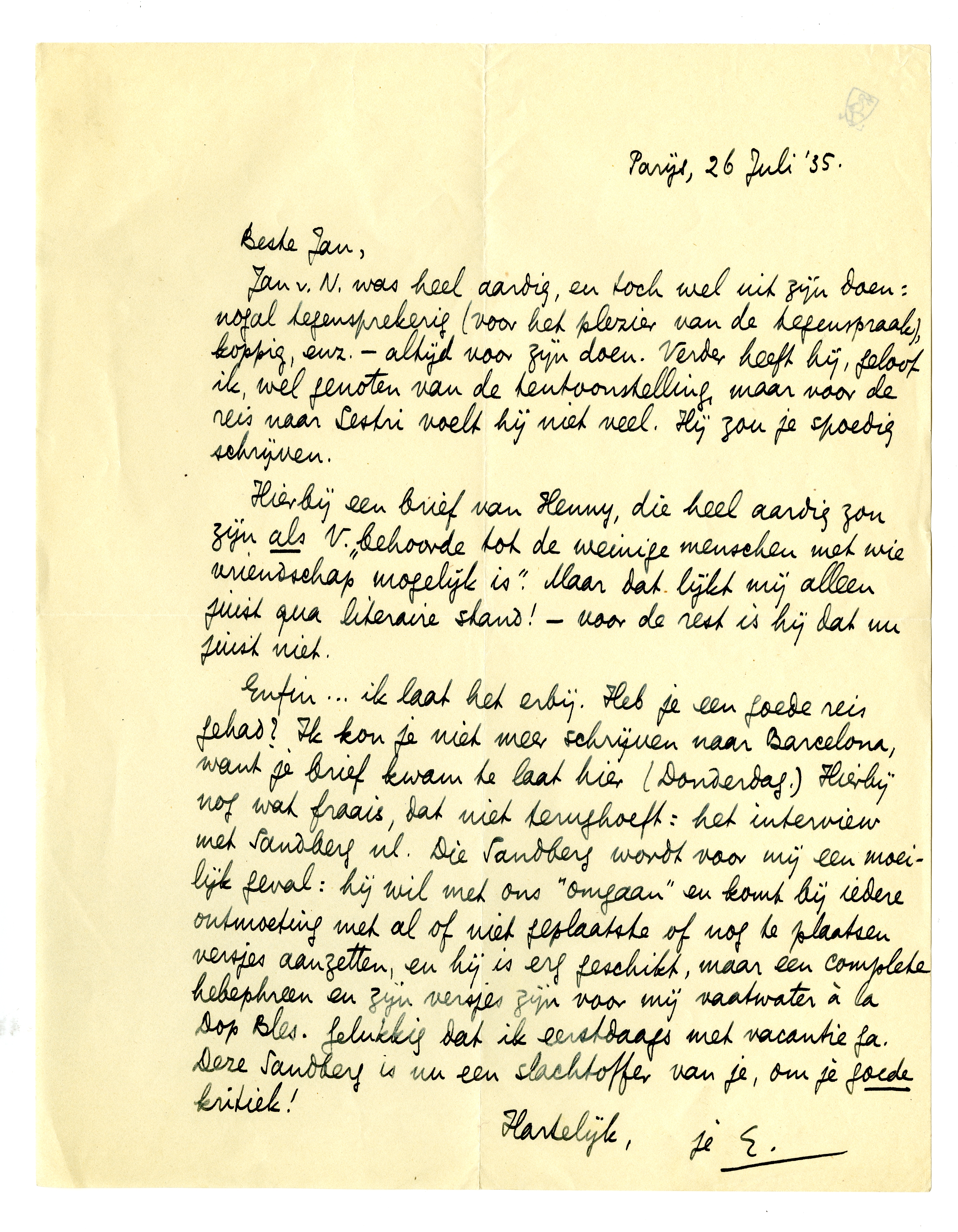 Enfin... ik laat het erbij. Heb je een goede reis gehad? Ik kon je niet meer schrijven naar Barcelona, want je brief kwam te laat hier (Donderdag.) Hierbij nog wat fraais, dat niet terughoeft: het interview met Sandberg nl. Die Sandberg wordt voor mij een moeilijk geval: hij wil met ons ‘omgaan’ en komt bij iedere ontmoeting met al of niet geplaatste of nog te plaatsen versjes aanzetten, en hij is erg geschikt, maar een complete hebephreen en zijn versjes zijn voor mij vaatwater à la Dop Bles. Gelukkig dat ik eerstdaags met vacantie ga. Deze Sandberg is nu een slachtoffer van je, om je goede kritiek!