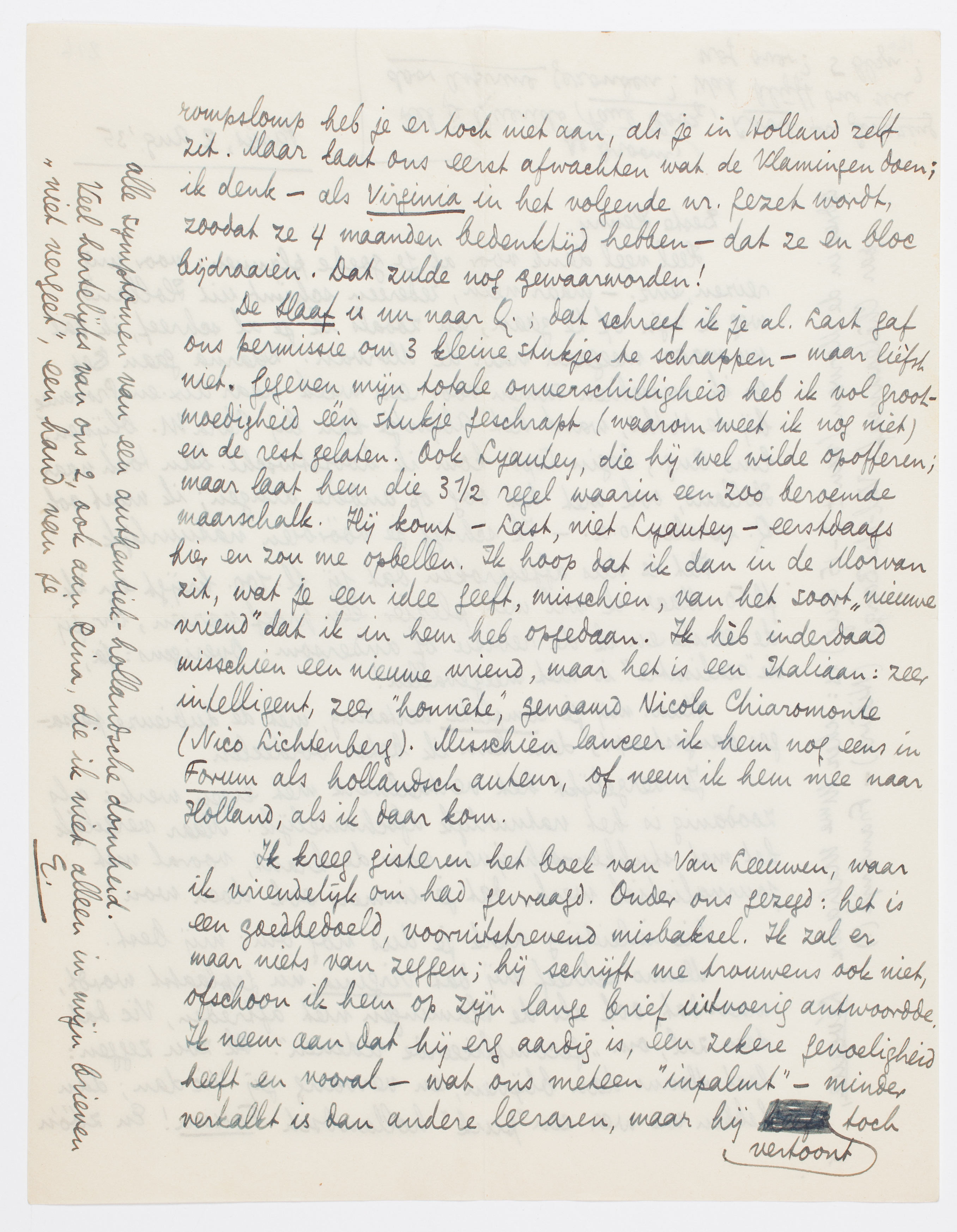De Slaaf is nu naar Q.; dat schreef ik je al. Last gaf ons permissie om 3 kleine stukjes te schrappen - maar lièfst niet. Gegeven mijn totale onverschilligheid heb ik vol grootmoedigheid één stukje geschrapt (waarom weet ik nog niet) en de rest gelaten. Ook Lyautey, die hij wel wilde opofferen; maar laat hem die 3½ regel waarin een zoo beroemde maarschalk. Hij komt - Last, niet Lyautey - eerstdaags hier en zou me opbellen. Ik hoop dat ik dan in de Morvan zit, wat je een idee geeft, misschien, van het soort ‘nieuwe vriend’ dat ik in hem heb opgedaan. Ik hèb inderdaad misschien een nieuwe vriend, maar het is een Italiaan: zeer intelligent, zeer ‘hon-nête’, genaamd Nicola Chiaromonte (Nico Lichtenberg). Misschien lanceer ik hem nog eens in Forum als hollandsch auteur, of neem ik hem mee naar Holland, als ik daar kom.