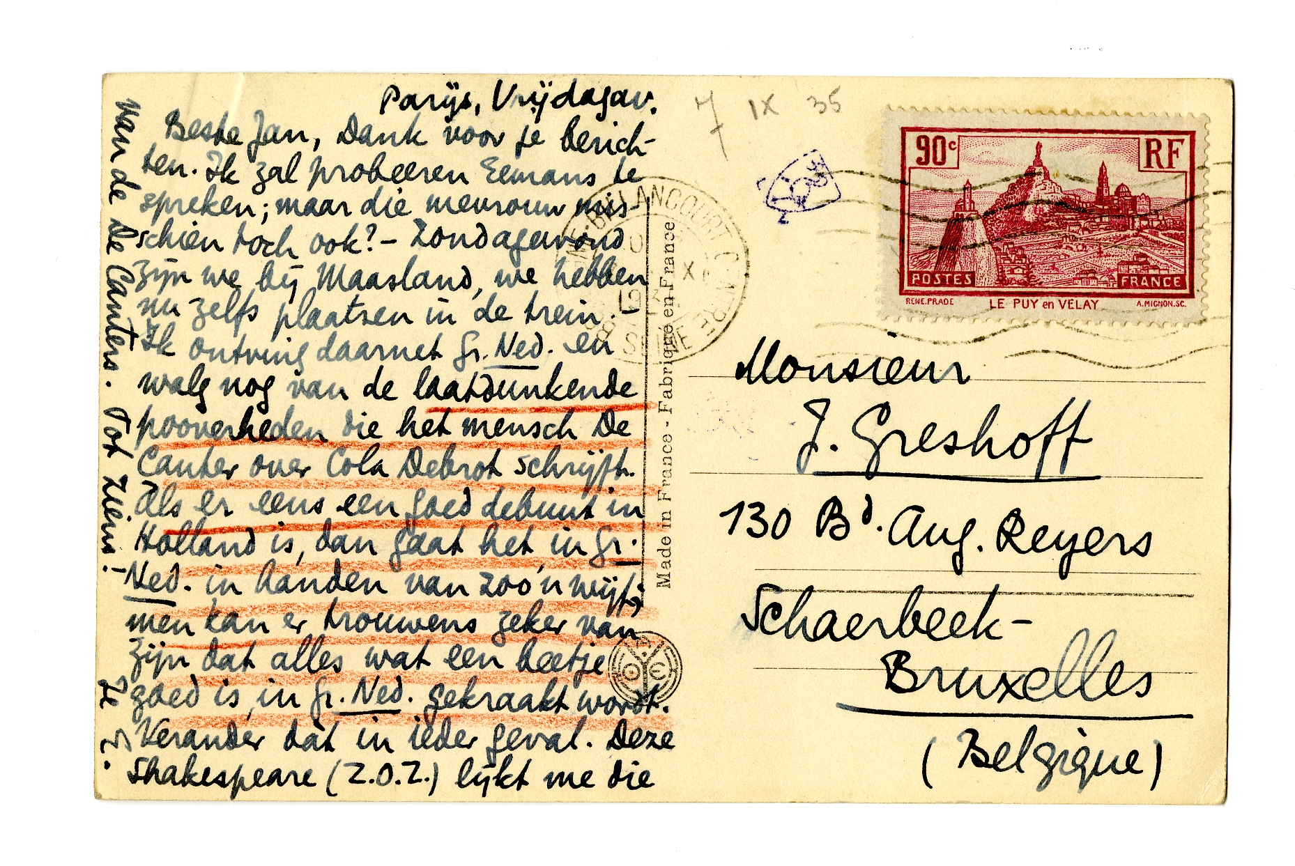 Beste Jan, Dank voor je berichten. Ik zal probeeren Eemans te spreken; maar die mevrouw misschien toch ook?3869 - Zondagavond zijn we bij Maasland, we hebben nu zelfs plaatsen in de trein. - Ik ontving daarnet Gr. Ned. en walg nog van de laatdunkende pooverheden die het mensch De Canter over Cola Debrot schrijft.3870 Als er eens een goed debuut in Holland is, dan gaat het in Gr. Ned. in handen van zoo'n wijf; men kan er trouwens zeker van zijn dat alles wat een beetje goed is, in Gr. Ned. gekraakt wordt. Verander dàt in ieder geval. Deze Shakespeare (Z.O.Z.) lijkt me die van de De Canters. Tot ziens!