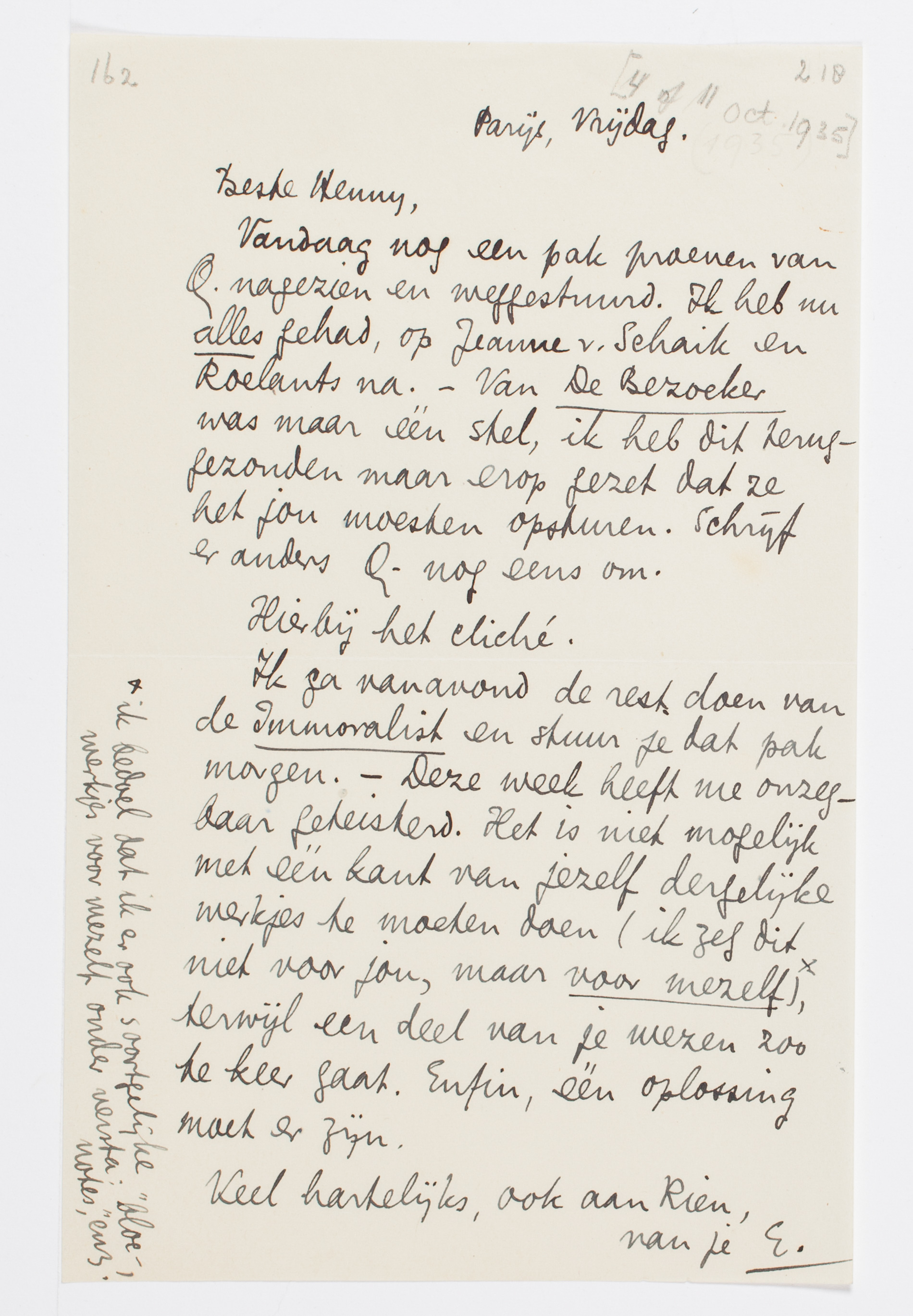 Vandaag nog een pak proeven van Q. nagezien en weggestuurd. Ik heb nu alles gehad, op Jeanne v. Schaik en Roelants na. - Van De Bezoeker was maar één stel, ik heb dit teruggezonden maar erop gezet dat ze het jou moesten opsturen. Schrijf er anders Q. nog eens om.