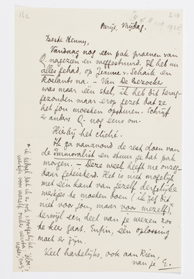Ik ga vanavond de rest doen van de Immoralist en stuur je dat pak morgen. - Deze week heeft me onzegbaar geteisterd. Het is niet mogelijk met één kant van jezelf dergelijke werkjes te moeten doen (ik zeg dit niet voor jou, maar voor mezelf),* terwijl een deel van je wezen zoo te keer gaat. Enfin, één oplossing moet er zijn.
