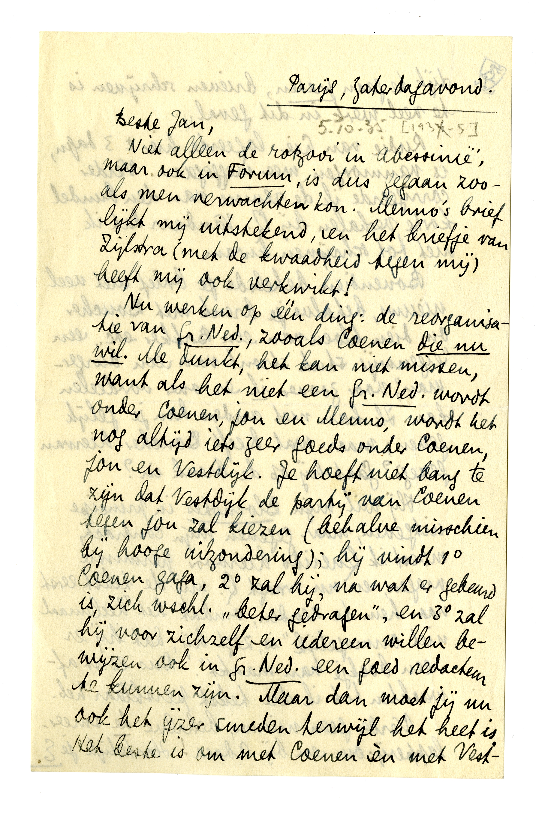 Niet alleen de rotzooi in Abessinië,3877 maar ook in Forum,3878 is dus gegaan zooals men verwachten kon. Menno's brief lijkt mij uitstekend, en het briefje van Zijlstra (met kwaadheid tegen mij) heeft mij ook verkwikt!