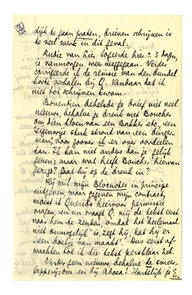 Nu werken op één ding: de reorganisatie van Gr. Ned., zooals Coenen die nu wil. Me dunkt, het kan niet missen, want als het niet een Gr. Ned. wordt onder Coenen, jou en Menno, wordt het nog altijd iets zeer goeds onder Coenen, jou en Vestdijk. Je hoeft niet bang te zijn dat Vestdijk de partij van Coenen tegen jou zal kiezen (behalve misschien bij hooge uizondering); hij vindt 1o Coenen gaga, 2o zal hij, na wat er gebeurd is, zich wschl. ‘beter gedragen’, en 3o zal hij voor zichzelf en iedereen willen bewijzen ook in Gr. Ned. een goed redacteur te kunnen zijn. Maar dan moet jij nu ook het ijzer smeden terwijl het heet is. Het beste is om met Coenen èn met Vestdijk te gaan praten, brieven schrijven is te veel werk in dit geval.