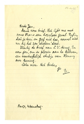 Dank voor brief. Het lijkt me met oome Frans een hopeloos geval. Enfin, hoû je taai en geef niet toe, vooral niet nu hij het zoo ‘stiekem’ doet.