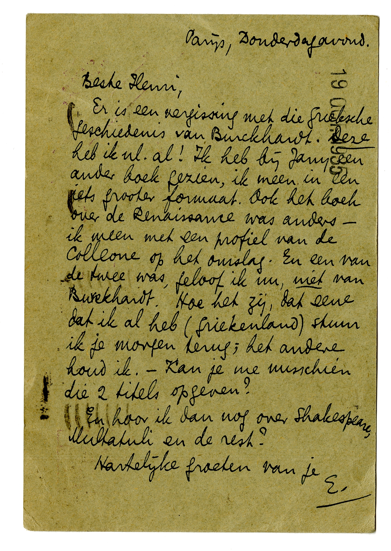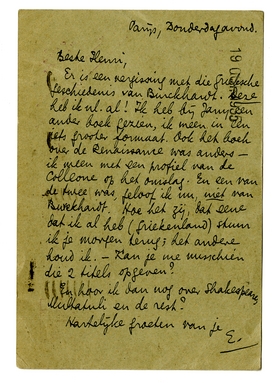 Er is een vergissing met die Grieksche geschiedenis van Burckhardt.3889 Deze heb ik nl. al! Ik heb bij Jany een ander boek gezien, ik meen in een iets grooter formaat. Ook het boek over de Renaissance3890 was anders - ik meen met een profiel van de Colleone op het omslag. En een van de twee was, geloof ik nu, niet van Burckhardt. Hoe het zij, dat eene dat ik al heb (Griekenland) stuur ik je morgen terug; het andere houd ik. - Kan je me misschien die 2 titels opgeven?