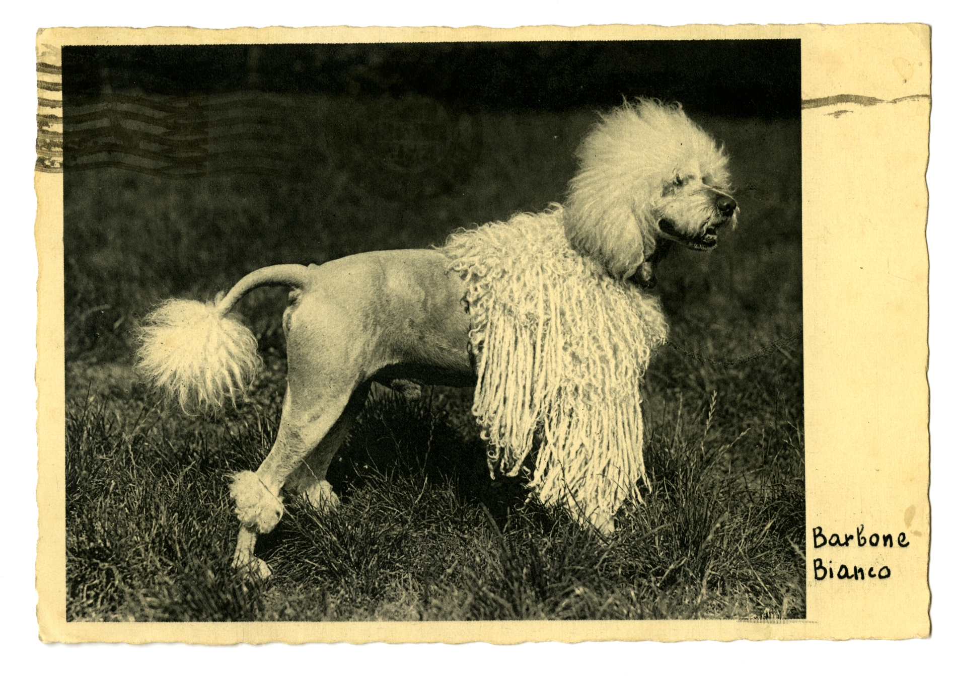 3896Prentbriefkaart: foto van witte, halfgeschoren poedel met bijschrift ‘barbone bianco’.