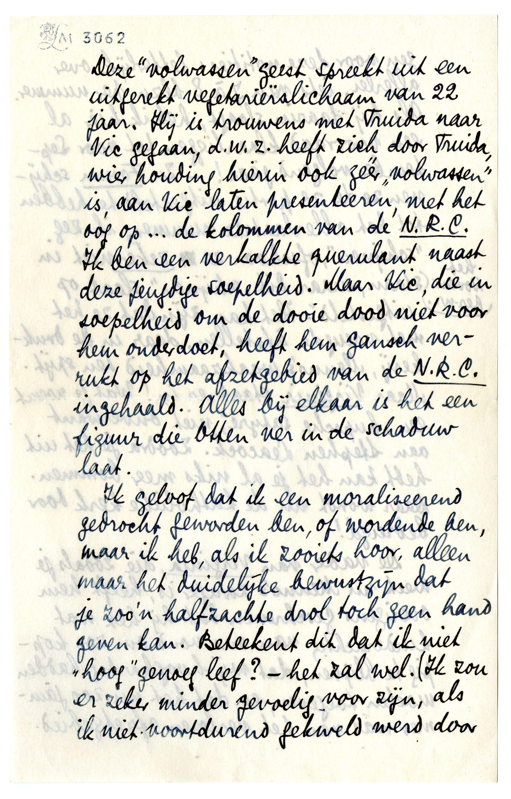 De vader van Virginia, die zooals je weet nu Menno's zwager is, heeft hem overigens geschreven dat hij het wat kinderachtig van ons vond om zoo koppig te blijven, dat wij hooghartig hadden moeten toegeven, en dat het nu zoo jammer was van het verloren afzetgebied. Deze ‘volwassen’ geest spreekt uit een uitgerekt vegetariërslichaam van 22 jaar. Hij is trouwens met Truida naar Vic gegaan, d.w.z. heeft zich door Truida, wier houding hierin ook zéér ‘volwassen’ is, aan Vic laten presenteeren, met het oog op... de kolommen van de N.R.C. Ik ben een verkalkte querulant naast deze jeugdige soepelheid. Maar Vic, die in soepelheid om de dooie dood niet voor hem onderdoet, heeft hem gansch verrukt op het afzetgebied van de N.R.C. ingehaald. Alles bij elkaar is het een figuur die Otten ver in de schaduw laat.