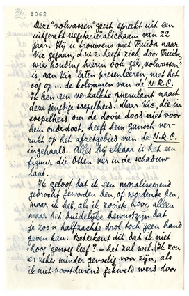 Jan heeft beloofd dat hij probeeren zou mij in Gr. Ned. een rubriek te bezorgen voor deze notities: letterlijk over allerlei, iets van 7 à 8 blzn. per nummer. Als hij daarin slaagt, heb ik hier al een voorraad klaarliggen tot voor September volgend jaar! - In Forum schijnen ze de 2e portie uitgesteld te hebben tot het allerlaatste nummer; ik zeg ‘schijnen’, ofschoon ze zeker niet in het November-nr. staan, maar dit ‘schijnen’ slaat op ‘uitgesteld’. Het kan zijn dat ze het met vreugde àfstellen, daar in de drukkerij, Menno's waakzaamheid ten spijt. Maar Virginia staat er in! Wat je noemt een ‘hupsche satyre’, niet onverwant aan Stephen Leacock.3934 Zoodra je het uit hebt kan het je al niks meer bommen. Daar wordt nu de katholieke kerk door bedreigd!