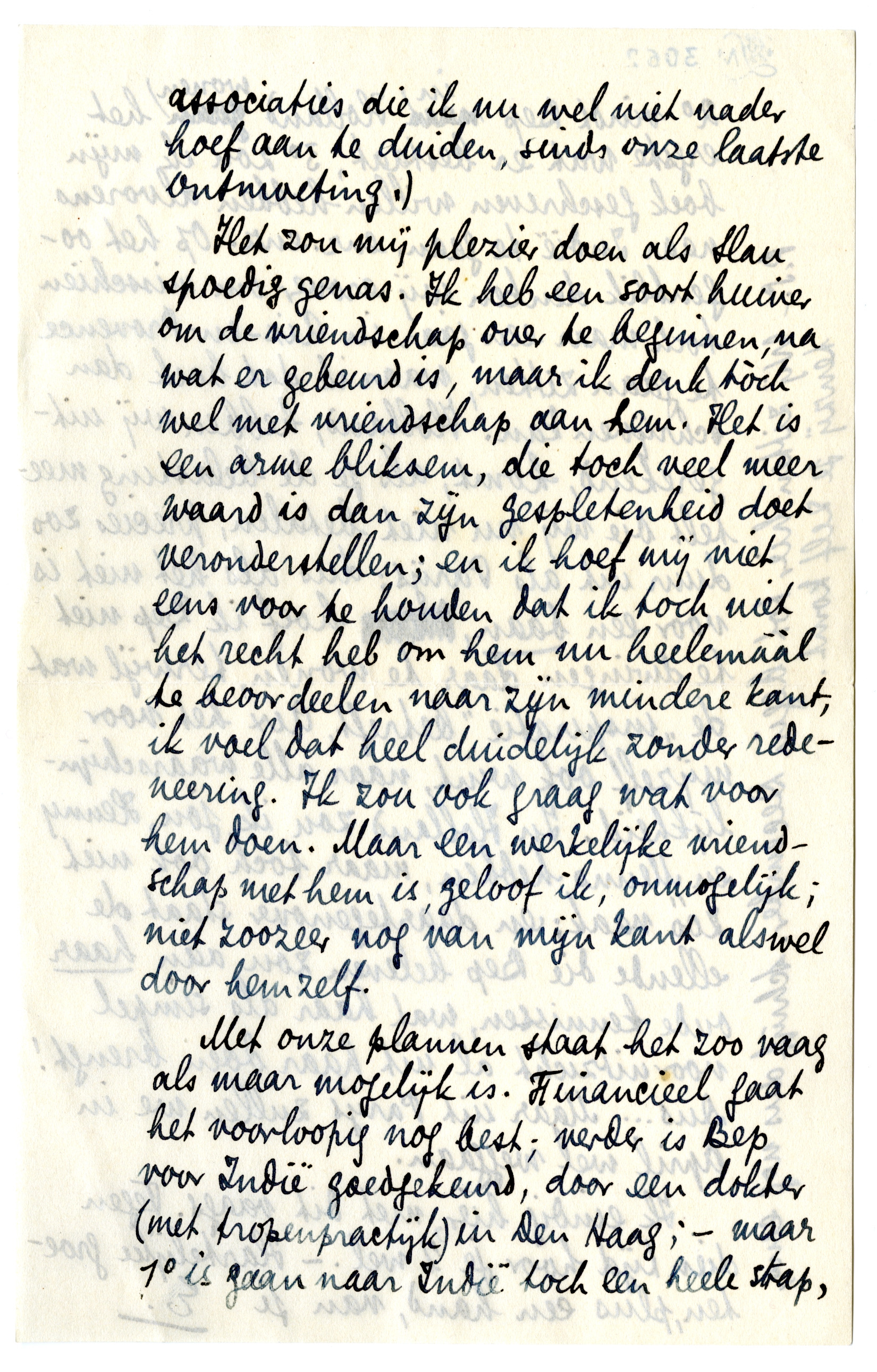 Met onze plannen staat het zoo vaag als maar mogelijk is. Financieel gaat het voorloopig nog best; verder is Bep voor Indië goedgekeurd, door een dokter (met tropenpractijk) in Den Haag; - maar 1o is gaan naar Indië toch een heele stap, 2o vindt Bep in Holland wonen het ergste wat er bestaat, 3o zou ik mijn boek geschreven willen hebben alvorens naar Indië te gaan, enz. enz. Op het oogenblik denken wij erover om misschien toch maar een jaar in Aix-en-Provence te gaan zitten, waar ik dat boek dan schrijven kan. Holland, hebben wij uitgerekend, komt, als je de belasting meetelt die wij nu niet betalen, precies zoo duur uit als Parijs; dus als het niet is voor een baan, hoef ik Bep niet te dwingen daar te wonen, terwijl wat de ‘inspiratie’ betreft, Aix het voor mijzelf ook wint, naar alle waarschijnlijkheid. In Holland zou ik jou, Henny en Menno hebben, maar toch ook niet zóó vaak; en daartegenover staat de ellende die Bep beleven zou aan haar oude kennissen, wat haar als simpel vooruitzicht al uit haar doen brengt! Dus... Maar uit Parijs zullen we in April wel weggaan.