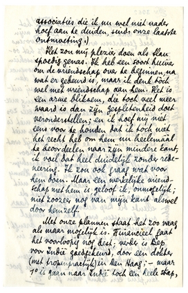 Het zou mij plezier doen als Slau spoedig genas. Ik heb een soort huiver om de vriendschap over te beginnen, na wat er gebeurd is, maar ik denk tòch wel met vriendschap aan hem. Het is een arme bliksem, die toch veel meer waard is dan zijn gespletenheid doet veronderstellen; en ik hoef mij niet eens voor te houden dat ik toch niet het recht heb om hem nu heelemààl te beoordeelen naar zijn mindere kant, ik voel dat heel duidelijk zonder redeneering. Ik zou ook graag wat voor hem doen. Maar een werkelijke vriendschap met hem is, geloof ik, onmogelijk; niet zoozeer nog van mijn kant alswel door hem zelf.