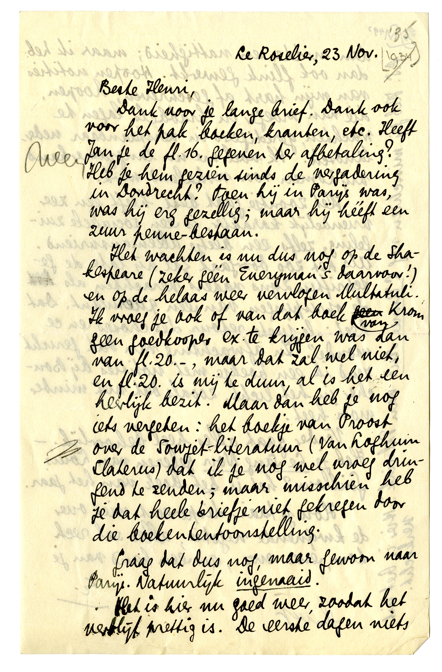 Het wachten is nu dus nog op de Shakespeare (zeker géén Everyman's daarvoor!) en op de helaas weer vervlogen Multatuli. Ik vroegje ook of van dat boek van Krom geen goedkooper ex. te krijgen was dan van fl. 20.-, maar dat zal wel niet, en fl. 20. is mij te duur, al is het een heerlijk bezit. Maar dan heb je nog iets vergeten: het boekje van Proost over de Sowjet-literatuur3942 (Van Loghum Slaterus) dat ik je nog wel vroeg dringend te zenden; maar misschien heb je dat heele briefje niet gekregen door die boekententoonstelling.3943