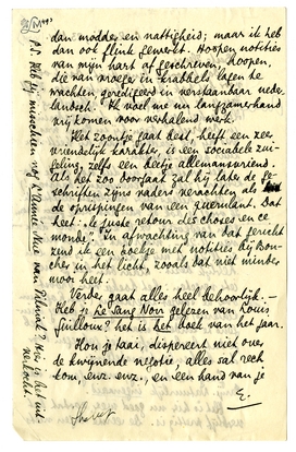 Dank voor je lange brief. Dank ook voor het pak boeken, kranten, etc. Heeft Jan je de fl. 16. gegeven ter afbetaling? Heb je hem gezien sinds de vergadering in Dordrecht?3941 Toen hij in Parijs was, was hij erg gezellig; maar hij hééft een zuur penne-bestaan.