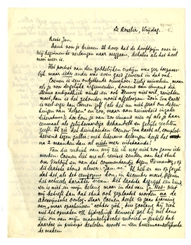 Coenen is een ontzettende ouwehoer. Zielig misschien, maar als je voor dergelijke argumenten, komend van iemand die Menno antipathiek vindt en ook Henny niet wil, zwichten moet, dan is het gedonder nooit afgeloopen. Zoo'n Eva Raedt is veel erger dan Coenen zelf (als het nu niet gaat om bedenkingen van ‘helpen’ en zoo, maar van zuiverheid inzake literatuur); hoe kom je van zoo iemand weer af als je haar eenmaal als gelijkwaardige behandelt en gelijke rechten geeft. Ik zie het huishouden Coenen-Eva Raedt al, complot-teerend tegen jullie: met literaire belangen heeft het na 2 maanden dan al niets meer uitstaande!