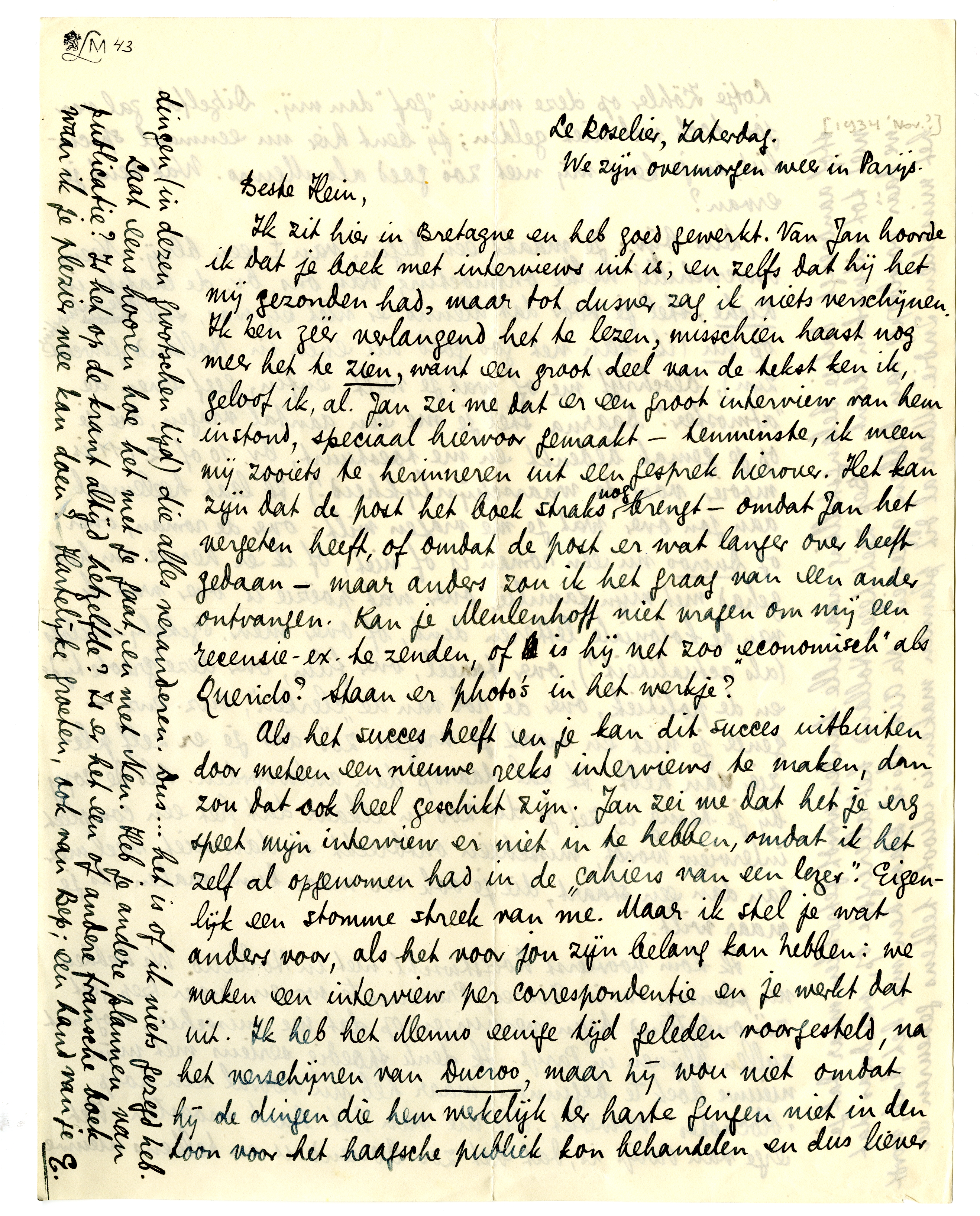Ik zit hier in Bretagne en heb goed gewerkt. Van Jan hoorde ik dat je boek met interviews uit is, en zelfs dat hij het mij gezonden had, maar tot dusver zag ik niets verschijnen. Ik ben zéér verlangend het te lezen, misschien haast nog meer het te zien, want een groot deel van de tekst ken ik, geloof ik, al. Jan zei me dat er een groot interview van hem instond, speciaal hiervoor gemaakt - tenminste, ik meen mij zooiets te herinneren uit een gesprek hierover. Het kan zijn dat de post het boek straks nog brengt - omdat Jan het vergeten heeft, of omdat de post er wat langer over heeft gedaan - maar anders zou ik het graag van een ander ontvangen. Kan je Meulenhoff niet vragen om mij een recensie-ex. te zenden, of is hij net zoo ‘economisch’ als Querido? Staan er photo's in het werkje.?