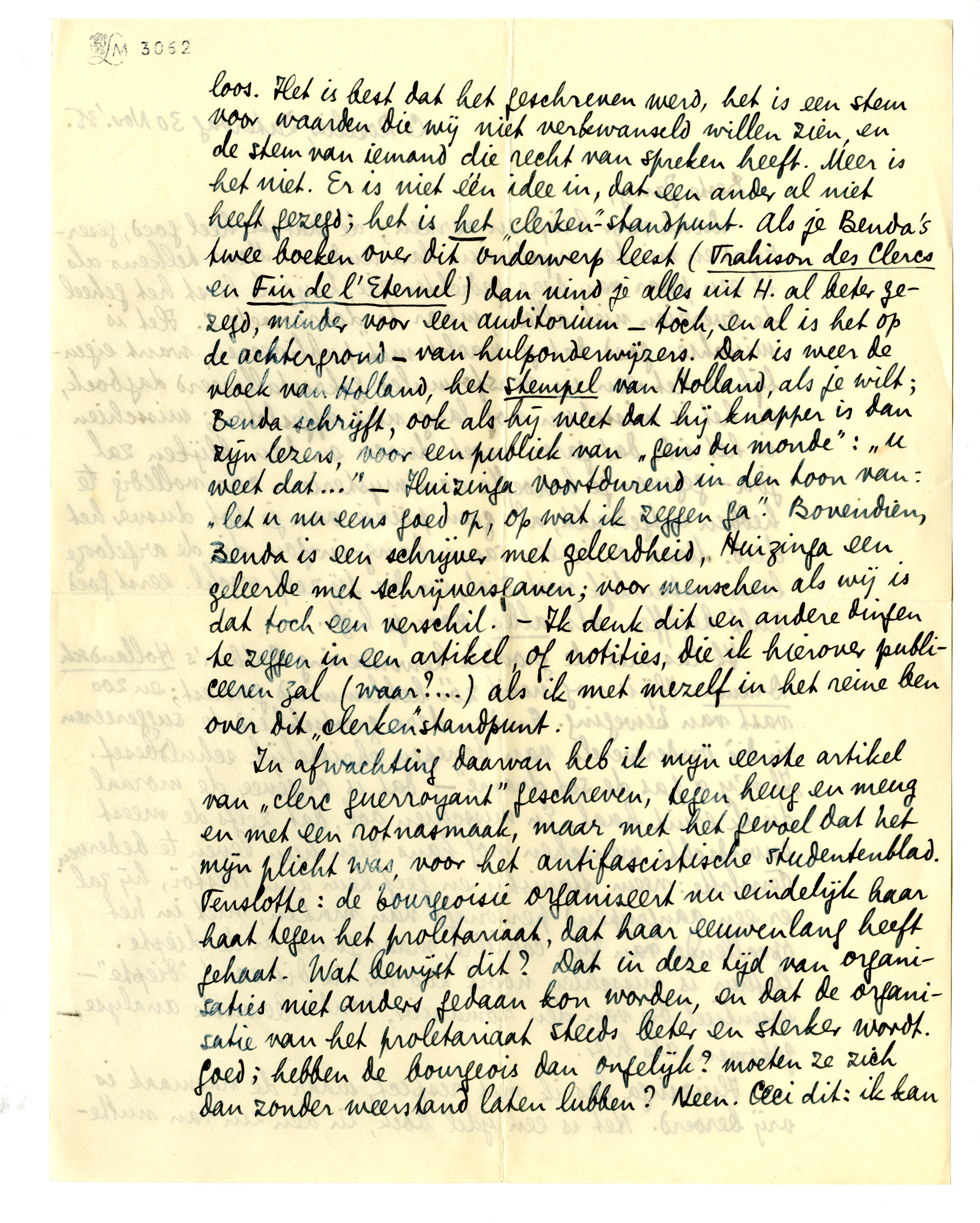 In afwachting daarvan heb ik mijn eerste artikel van ‘clerc guerroyant’ geschreven, tegen heug en meug en met een rot nasmaak, maar met het gevoel dat het mijn plicht was, voor het antifascistische studentenblad. Tenslotte: de bourgeoisie organiseert nu eindelijk haar haat tegen het proletariaat, dat haar eeuwenlang heeft gehaat. Wat bewijst dit? Dat in deze tijd van organisaties niet anders gedaan kon worden, en dat de organisatie van het proletariaat steeds beter en sterker wordt. Goed; hebben de bourgeois dan ongelijk? moeten ze zich dan zonder weerstand laten lubben? Neen. Ceci dit: ik kan onmogelijk aan dien kant staan, al is het ‘mijn klasse’ dan. Met al mijn afkeer voor allerlei dingen van het kommunisme, vooral op artistiek gebied, maar ook elders, ook in het heele element Stalin (gezien als tegenstander van het element Trotsky, en op zichzelf), kan ik werkelijk niet zeggen dat de bourgeois gelijk hebben. Of je moet absoluut als politicus gaan denken, als ‘realist’, als ‘temporel’ sec (Benda), je moet werkelijk zeggen dat je lak hebt aan zulke dingen als rechtvaardigheid en moraal. Het gelijk van de bourgeois is een puur practisch gelijk; het kapitalisme is verrot, de bevrijding van de laatste slaven is het hoogste doel voor de menschheid, zoolang men zich tot deze aarde bepaalt. Dus als ik werkelijk partij koos voor de bourgeoisie zou ik voor mijzelf weten dat ik inderdaad een gelijk zou kunnen laten gelden, maar van een verdomd laag soort.