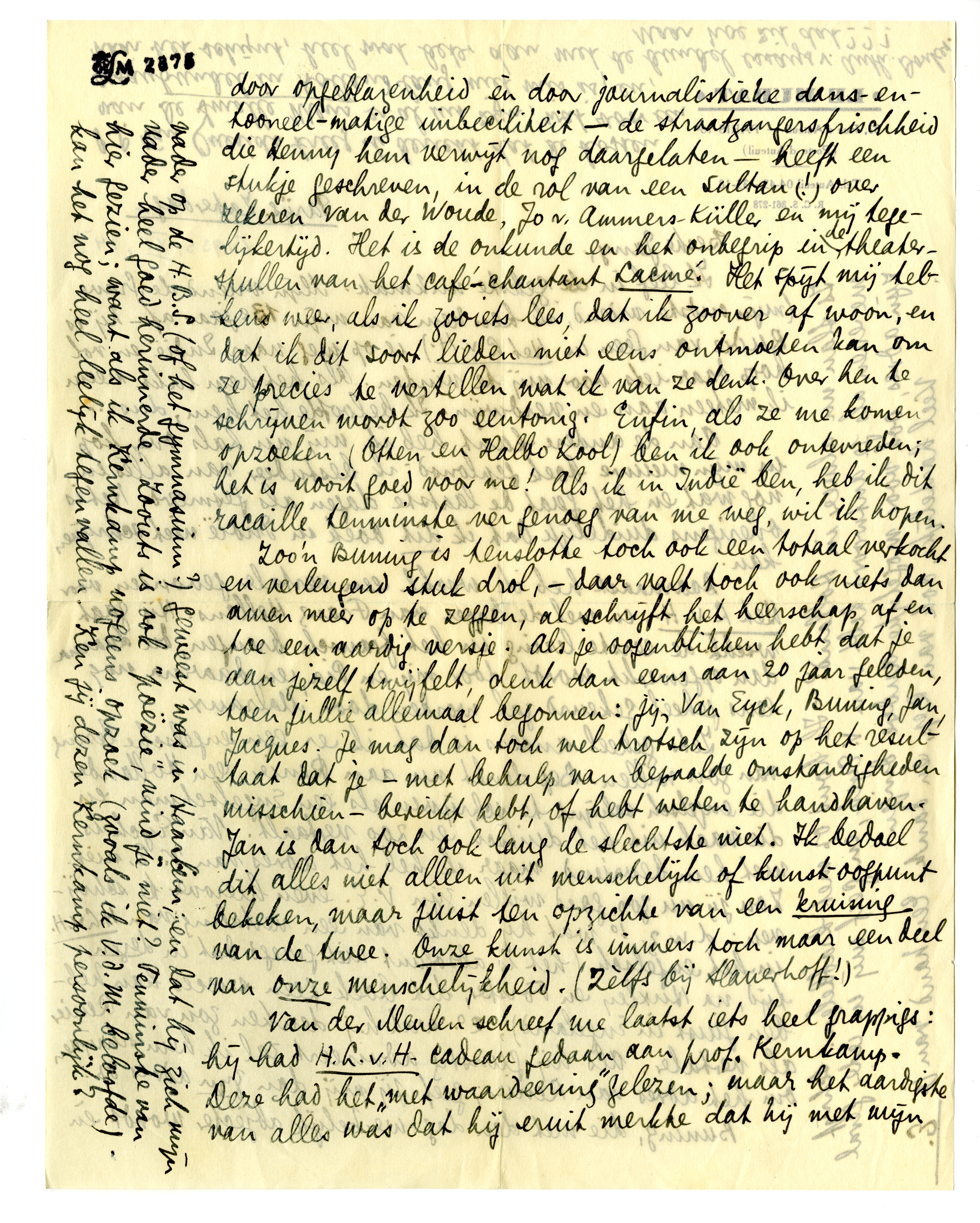 Zoo'n Buning is tenslotte toch ook een totaal verkocht en verleugend stuk drol, - daar valt toch ook niets dan amen meer op te zeggen, al schrijft het heerschap af en toe een aardig versje. Als je oogenblikken hebt dat je aan jezelf twijfelt, denk dan eens aan 20 jaar geleden, toen jullie allemaal begonnen: jij, Van Eyck, Buning, Jan, Jacques. Je mag dan toch wel trotsch zijn op het resultaat dat je - met behulp van bepaalde omstandigheden misschien - bereikt hebt, of hebt weten te handhaven. Jan is dan toch ook lang de slechtste niet. Ik bedoel dit alles niet alleen uit menschelijk of kunst-oogpunt bekeken, maar juist ten opzichte van een kruising van de twee. Onze kunst is immers toch maar een deel van onze menschelijkheid. (Zèlfs bij Slauerhoff!)