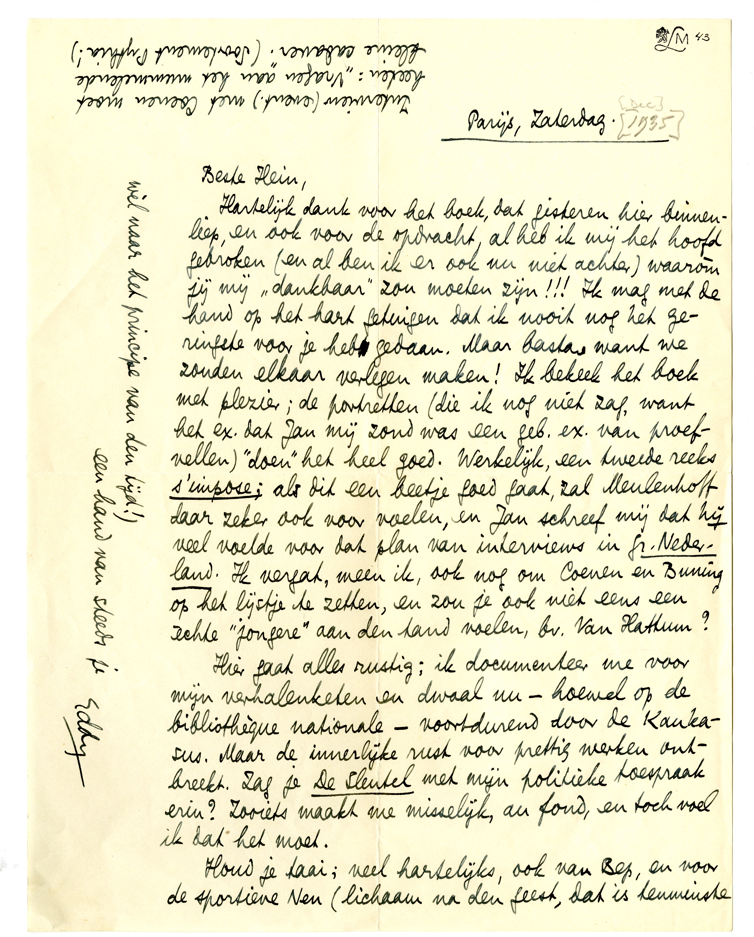 Hier gaat alles rustig; ik documenteer me voor mijn verhalenke-ten en dwaal nu - hoewel op de bibliothèque nationale - voortdurend door de Kaukasus. Maar de innerlijke rust voor prettig werken ontbreekt. Zag je De Sleutel met mijn politieke toespraak erin? Zooiets maakt me misselijk, au fond, en toch voel ik dat het moet.