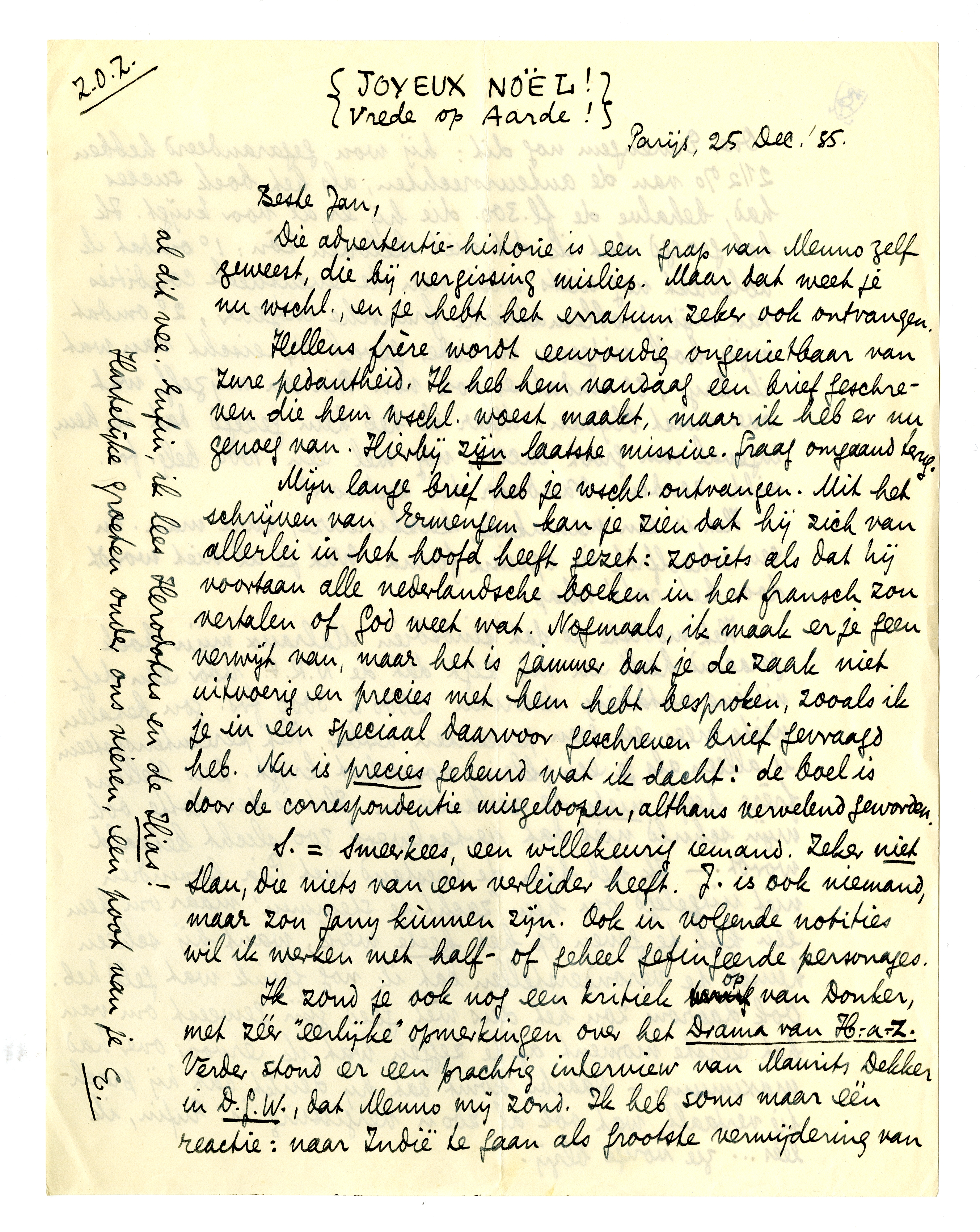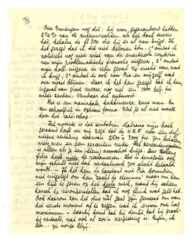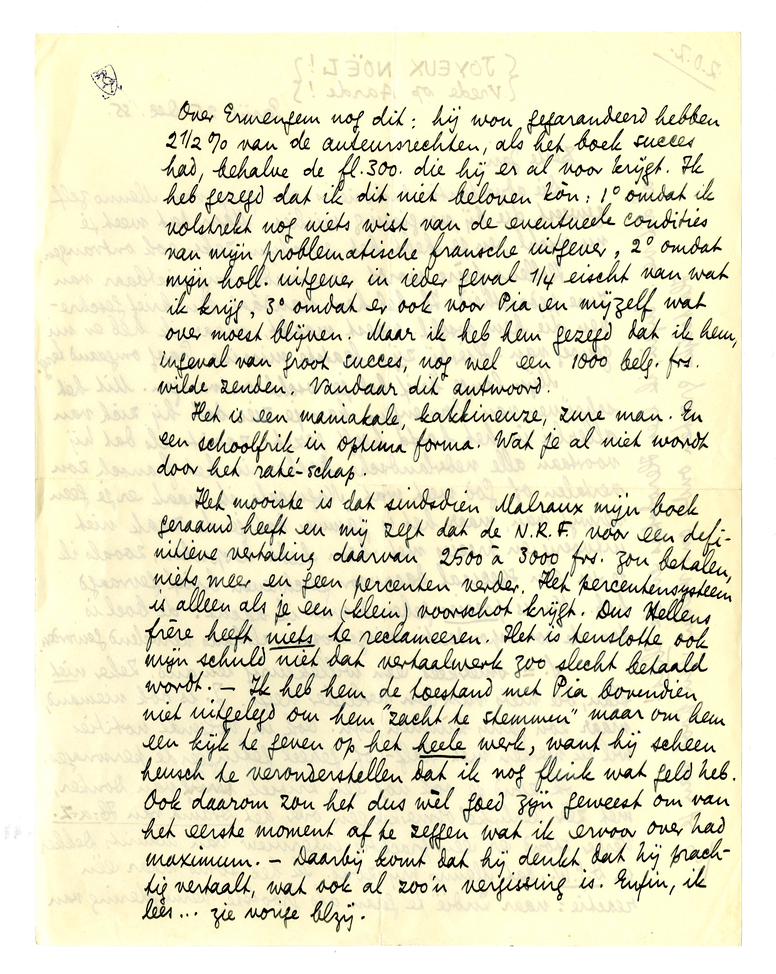 Over Ermengem nog dit: hij wou gegarandeerd hebben 2½% van de auteursrechten, als het boek succes had, behalve de fl. 300. die hij er al voor krijgt. Ik heb gezegd dat ik dit niet beloven kòn: 1e omdat ik volstrekt nog niets wist van de eventueele condities van mijn problematische fransche uitgever, 2e omdat mijn holl. uitgever in ieder geval ¼ eischt van wat ik krijg, 3e omdat er ook voor Pia en mijzelf wat over moest blijven. Maar ik heb hem gezegd dat ik hem, ingeval van groot succes, nog wel een 1000 belg. frs. wilde zenden. Vandaar dit antwoord.