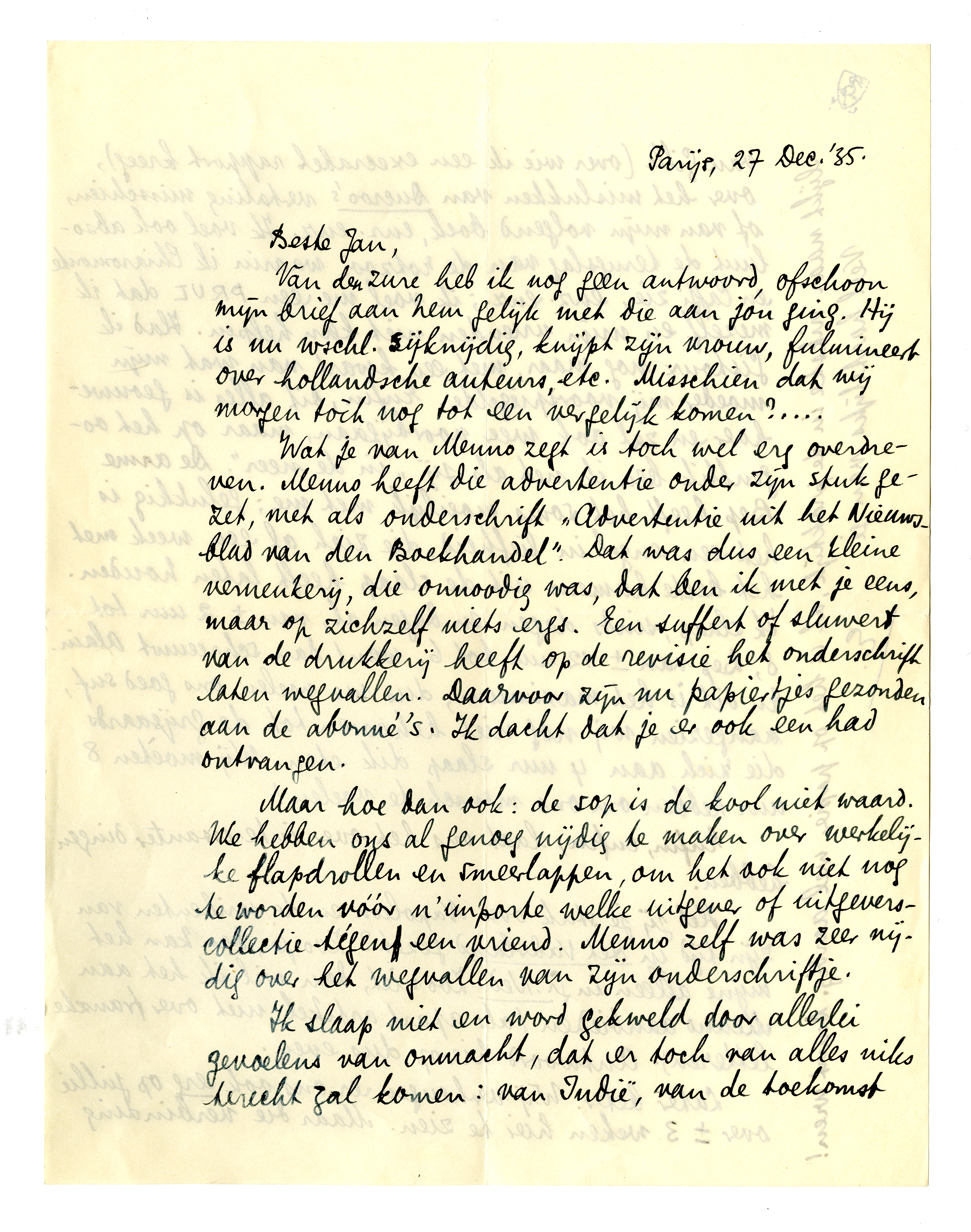 Wat je van Menno zegt is toch wel erg overdreven. Menno heeft die advertentie onder zijn stuk gezet, met als onderschrift ‘Advertentie uit het Nieuwsblad van den Boekhandel’. Dat was dus een kleine verneukerij, die onnoodig was, dat ben ik met je eens, maar op zichzelf niets ergs. Een suffert of sluwert van de drukkerij heeft op de revisie het onderschrift laten wegvallen. Daarvoor zijn nu papiertjes gezonden aan de abonné's. Ik dacht dat je er ook een had ontvangen.