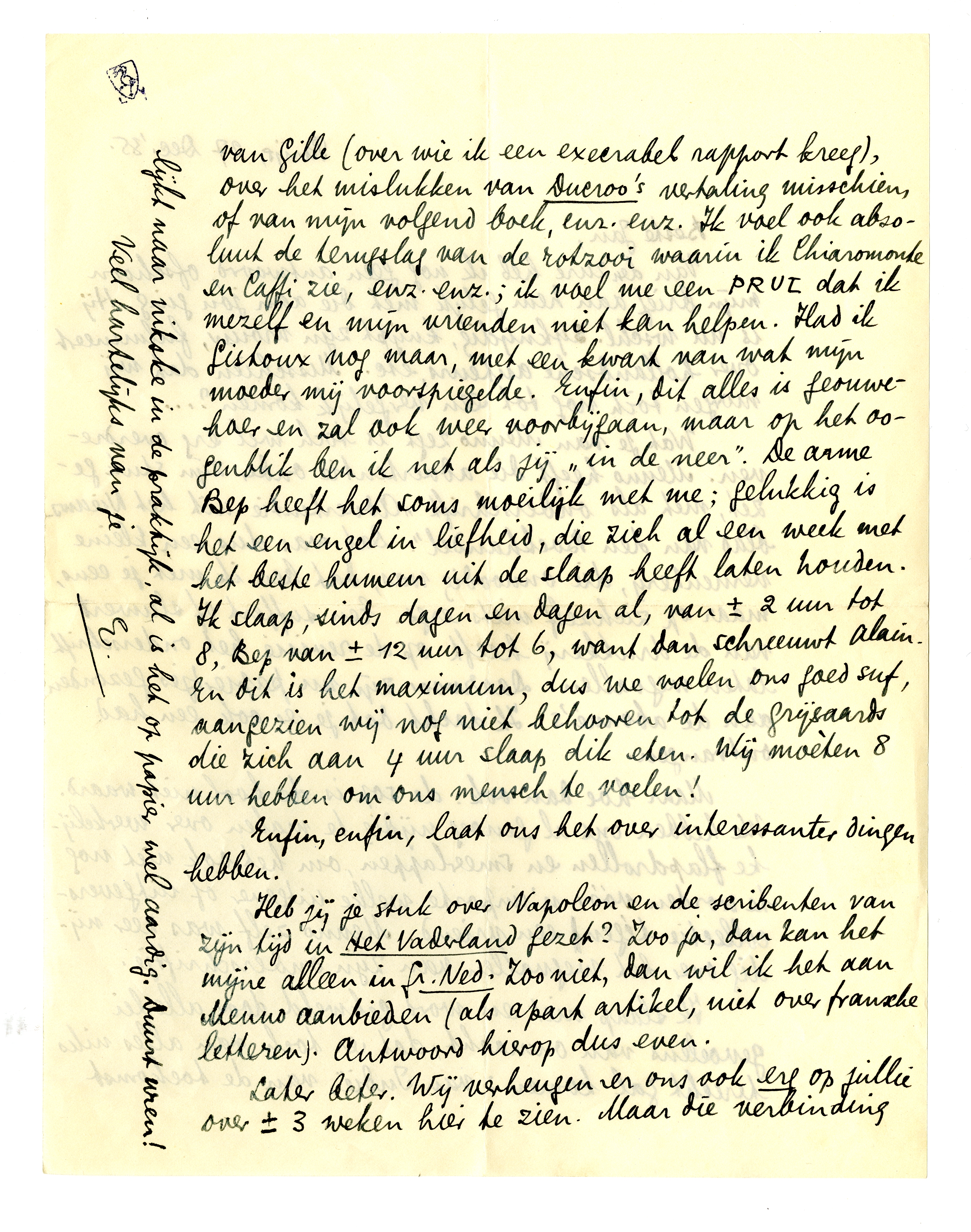 Ik slaap niet en word gekweld door allerlei gevoelens van onmacht, dat er toch van alles niks terecht zal komen: van Indië, van de toekomst van Gille (over wie ik een execrabel rapport kreeg), over het mislukken van Ducroo's vertaling misschien, of van mijn volgend boek, enz. enz. Ik voel ook absoluut de terugslag van de rot-zooi waarin ik Chiaromonte en Caffi zie, enz. enz.; ik voel me een PRUL dat ik mezelf en mijn vrienden niet kan helpen. Had ik Gistoux nog maar, met een kwart van wat mijn moeder mij voorspiegelde. Enfin, dit alles is geouwehoer en zal ook weer voorbijgaan, maar op het oogenblik ben ik net als jij ‘in de neer’. De arme Bep heeft het soms moeilijk met me; gelukkig is het een engel in liefheid, die zich al een week met het beste humeur uit de slaap heeft laten houden. Ik slaap, sinds dagen en dagen al, van ± 2 uur tot 8, Bep van ± 12 uur tot 6, want dan schreeuwt Alain. En dit is het maximum, dus we voelen ons goed suf, aangezien wij nog niet behooren tot de grijsaards die zich aan 4 uur slaap dik eten. Wij moèten 8 uur hebben om ons mensch te voelen!
