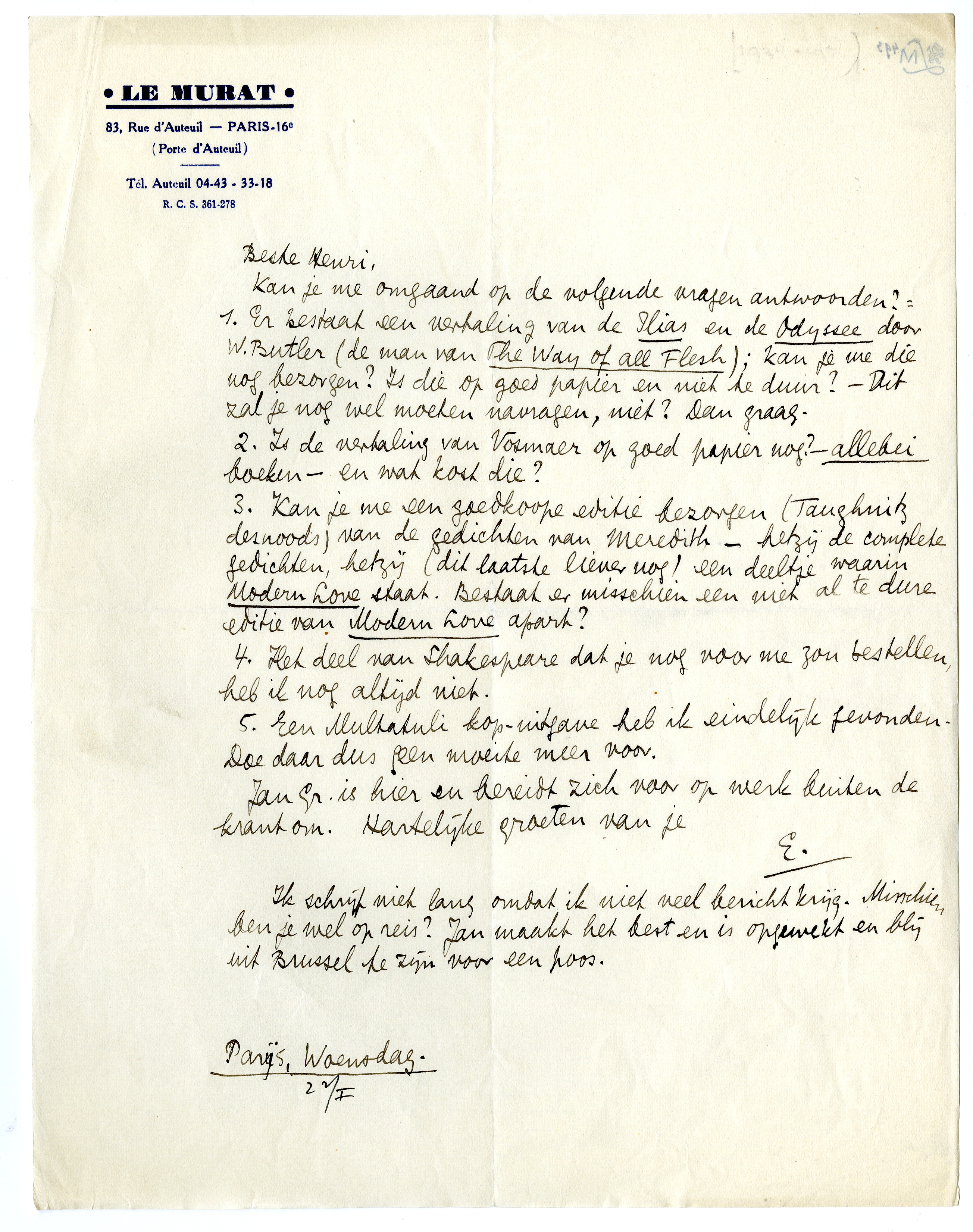 Kan je me omgaand op de volgende vragen antwoorden?: 1. Er bestaat een vertaling van de Ilias en de Odyssee door W. Butler (de man van The Way of all Flesh); kan je me die nog bezorgen? Is die op goed papier en niet te duur? - Dit zal je nog wel moeten navragen, niet? Dan graag.