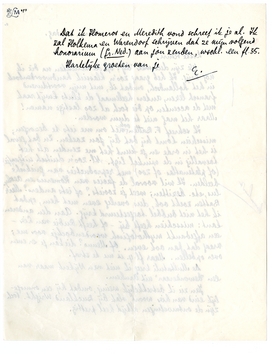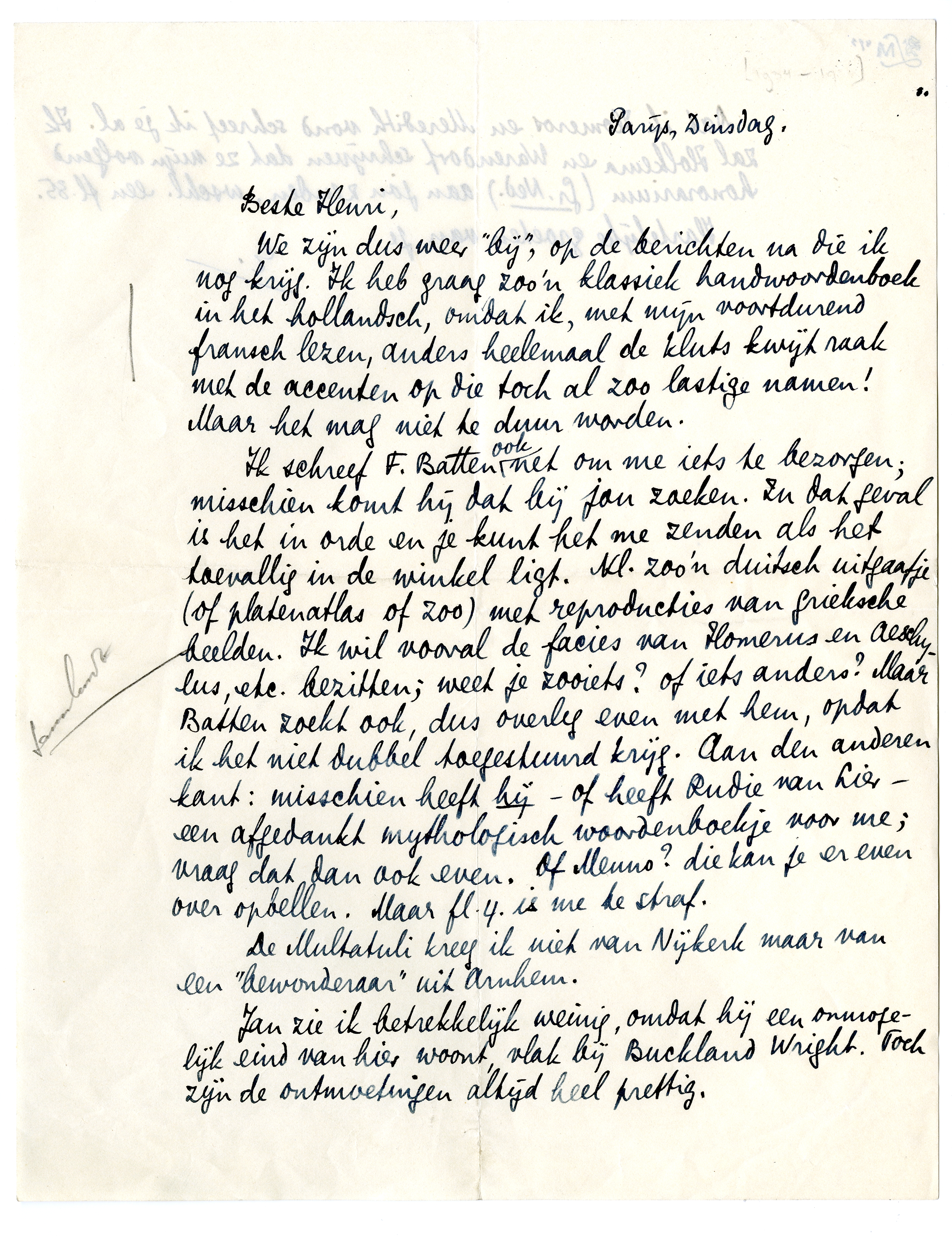 Ik schreef F. Batten ook net om me iets te bezorgen; misschien komt hij dat bij jou zoeken. In dat geval is het in orde en je kunt het me zenden als het toevallig in de winkel ligt. Nl. zoo'n duitsch uitgaafje (of platenatlas of zoo) met reproducties van grieksche beelden. Ik wil vooral de facies van Homerus en Aeschylus, etc. bezitten; weet je zooiets? of iets anders? Maar Batten zoekt ook, dus overleg even met hem, opdat ik het niet dubbel toegestuurd krijg. Aan den anderen kant: misschien heeft hij - of heeft Rudie van Lier - een afgedankt mythologisch woordenboekje voor me; vraag dat dan ook even. Of Menno? die kan je er even over opbellen. Maar fl. 4. is me te straf.