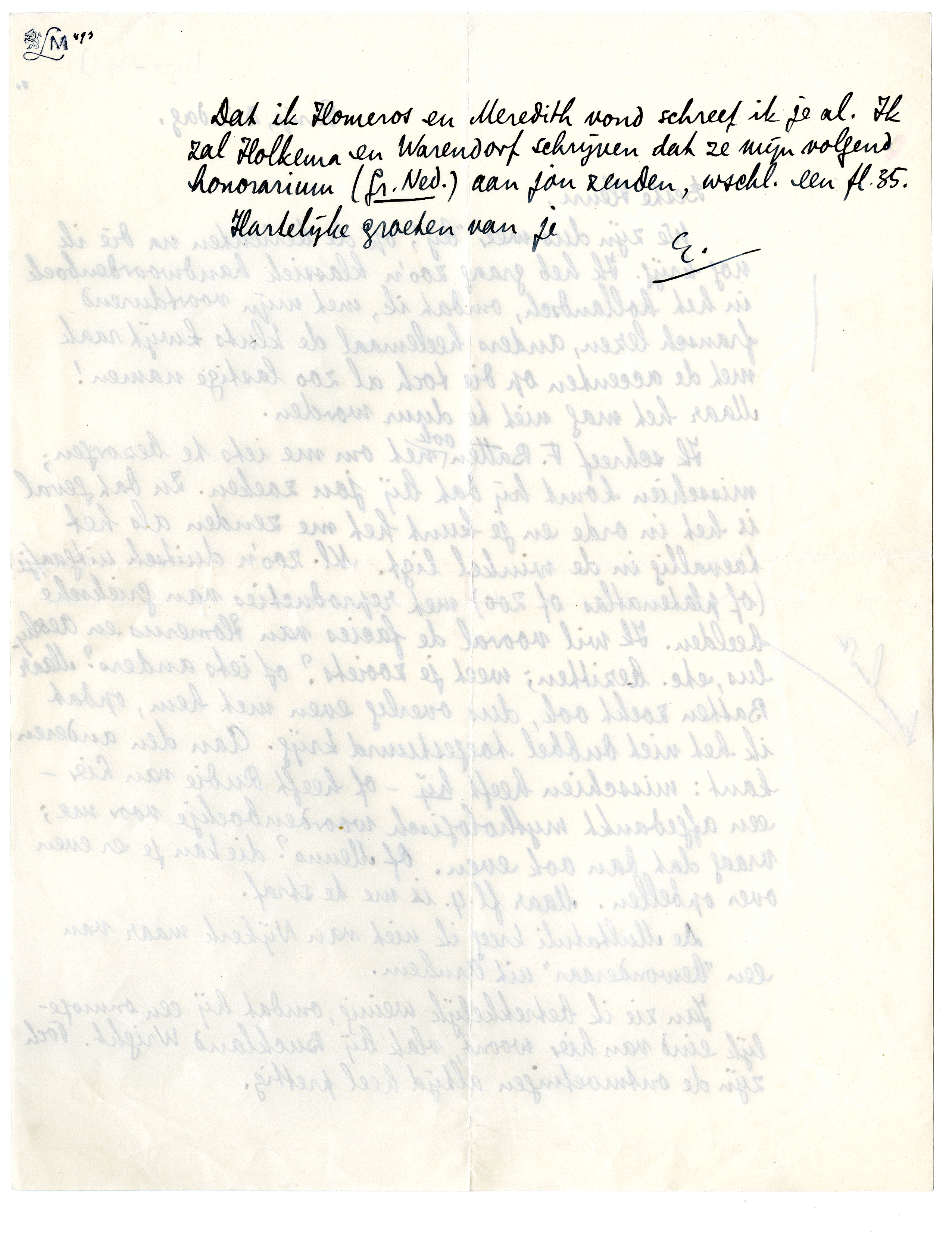 Dat ik Homeros en Meredith vond schreef ik je al. Ik zal Holkema en Warendorf schrijven dat ze mijn volgend honorarium (Gr. Ned.) aan jou zenden, wschl. een fl. 35.