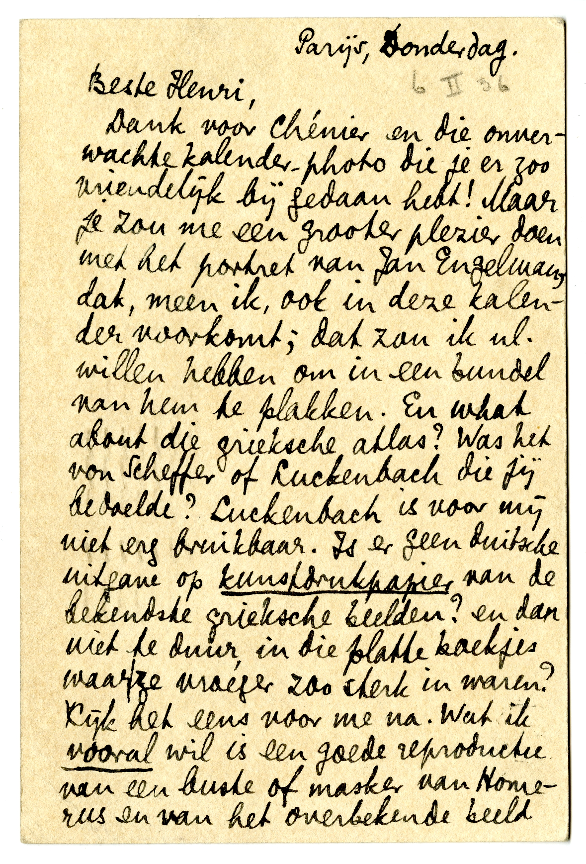 Dank voor Chénier en die onverwachte kalender-photo die je er zoo vriendelijk bij gedaan hebt! Maar je zou me een grooter plezier doen met het portret van Jan Engelman, dat, meen ik, ook in deze kalender voorkomt; dat zou ik nl. willen hebben om in een bundel van hem te plakken. En what about die grieksche atlas? Was het von Scheffer of Luckenbach die jij bedoelde? Luckenbach is voor mij niet erg bruikbaar. Is er geen duitsche uitgave op kunstdrukpapier van de bekendste grieksche beelden? en dan niet te duur, in die platte boekjes waar ze vroeger zoo sterk in waren? Kijk het eens voor me na. Wat ik vooral wil is een goede reproductie van een buste of masker van Homerus en van het overbekende beeld van Menelaos (of Ajax) met het lijk van Patroclos. Me dunkt, dat moet niet moeilijk zijn die reproducties te vinden.