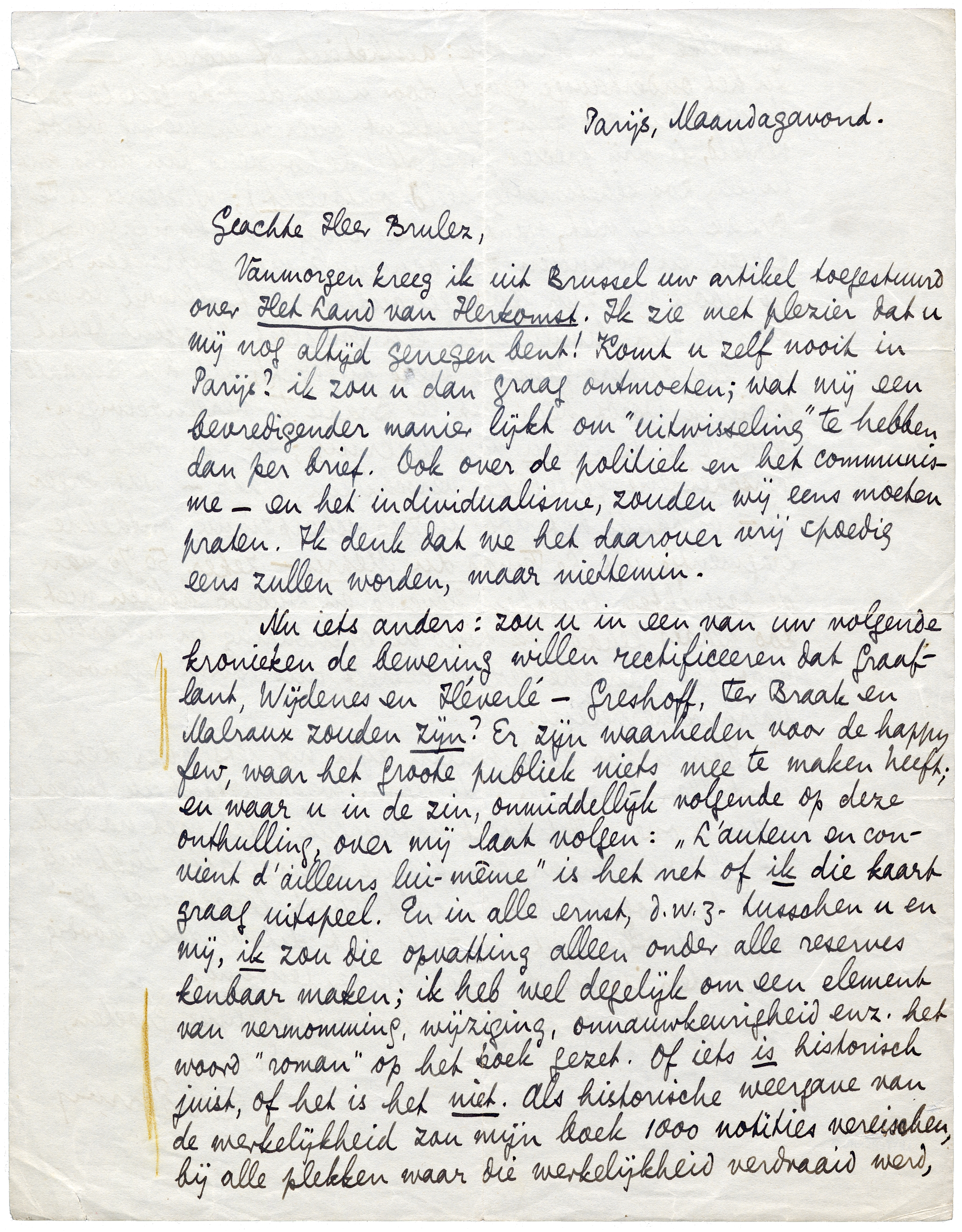 Vanmorgen kreeg ik uit Brussel uw artikel toegestuurd over Het Land van Herkomst.4075 Ik zie met plezier dat u mij nog altijd genegen bent! Komt u zelf nooit in Parijs? ik zou u dan graag ontmoeten; wat mij een bevredigender manier lijkt om ‘uitwisseling’ te hebben dan per brief. Ook over de politiek en het communisme - en het individualisme, zouden wij eens moeten praten. Ik denk dat we het daarover vrij spoedig eens zullen worden, maar niettemin.
