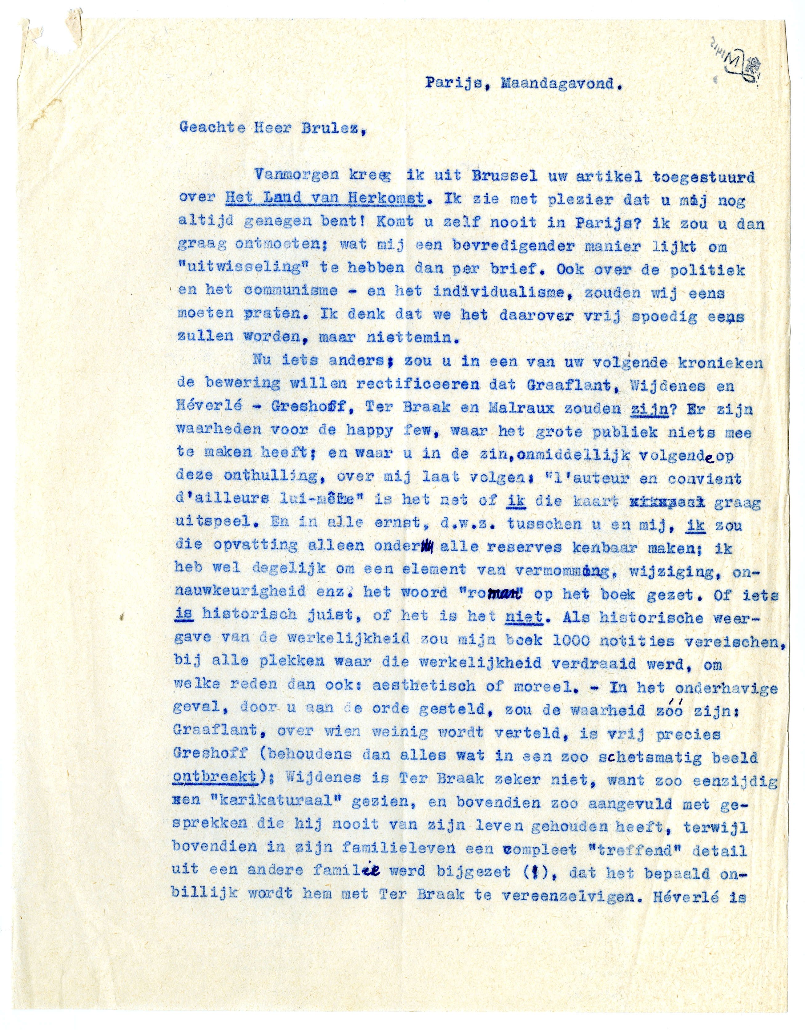 Nu iets anders: zou u in een van uw volgende kronieken de bewering willen rectificeeren4076 dat Graaflant, Wijdenes en Héverlé - Greshoff, Ter Braak en Malraux zouden zijn? Er zijn waarheden voor de happy few, waar het groote publiek niets mee te maken heeft; en waar u in de zin, onmiddellijk volgende op deze onthulling, over mij laat volgen: ‘L'auteur en convient d'ailleurs lui-même’ is het net of ik die kaart graag uitspeel. En in alle ernst, d.w.z. tusschen u en mij, ik zou die opvatting alleen onder alle reserves kenbaar maken; ik heb wel degelijk om een element van vermomming, wijziging, onnauwkeurigheid enz. het woord ‘roman’ op het boek gezet. Of iets is historisch juist, of het is het niet. Als historische weergave van de werkelijkheid zou mijn boek 1000 notities vereischen, bij alle plekken waar die werkelijkheid verdraaid werd, om welke reden dan ook: aesthetisch of moreel. - In het onderhavige geval, door u aan de orde gesteld, zou de waarheid zóó zijn: Graaflant, over wien weinig wordt verteld, is vrij precies Greshoff (behoudens dan alles wat in een zoo schetsmatig beeld ontbreekt); Wijdenes is Ter Braak zeker niet, want zoo eenzijdig en ‘karikaturaal’ gezien, en bovendien zoo aangevuld met gesprekken die hij nooit van zijn leven gehouden heeft, terwijl bovendien in zijn familieleven een compleet ‘treffend’ detail uit een andere familie werd bijgezet(!), dat het bepaald onbillijk wordt hem met Ter Braak te vereenzelvigen. Héverlé is de schim van Malraux; er zijn niet alleen verscheidene feitelijke verschillen, maar - wat erger is - ondanks het door u zoo scherpzinnig ontdekte fragmentje uit Le Temps du Mépris - zeker 50% van de gesprekken tusschen Héverlé en Ducroo hebben niet zóo plaats gehad. Ik vind de openbaring in uw artikel, waar het fransche lezers betreft, dus vooral tegenover Malraux vervelend.