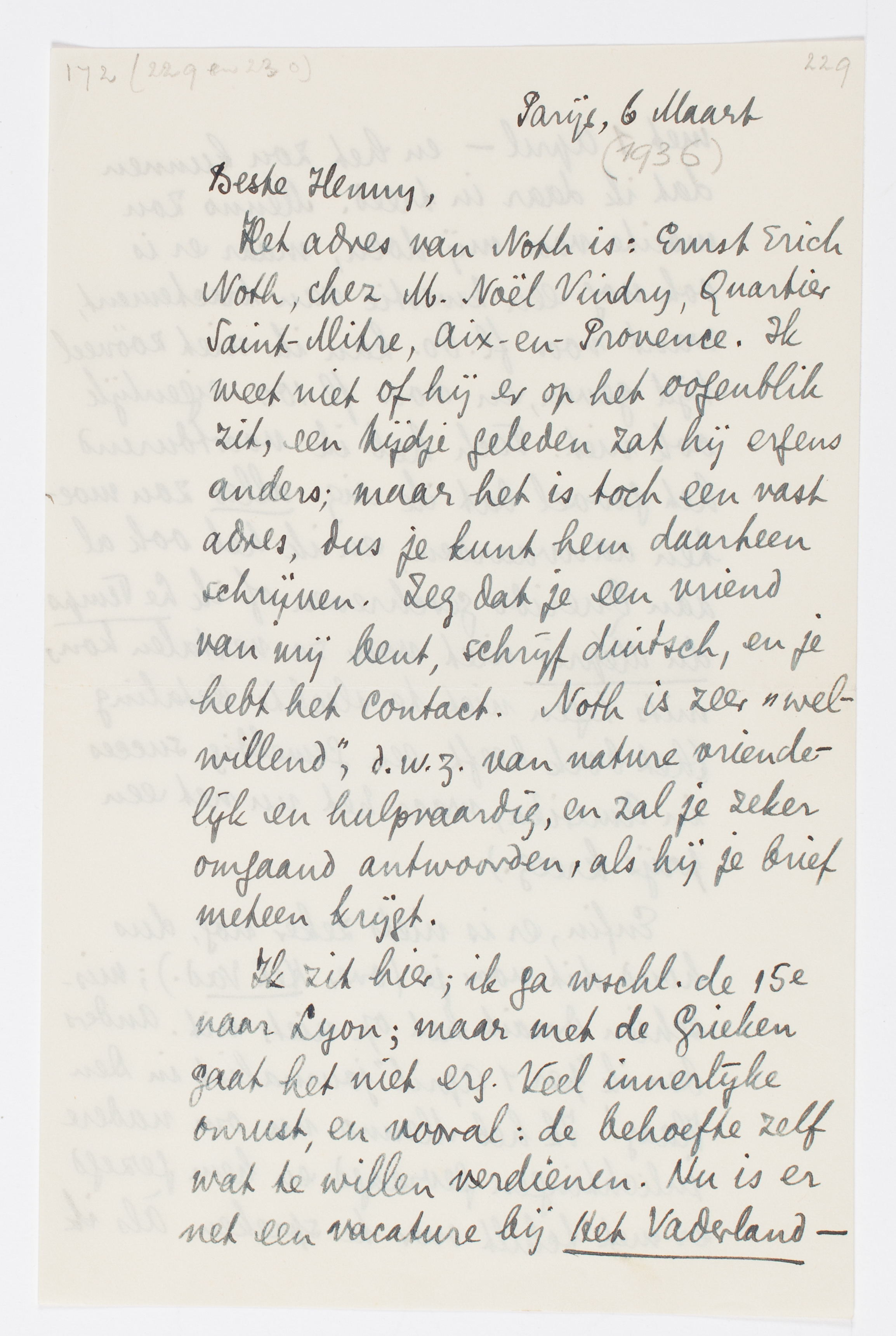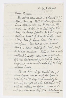 Het adres van Noth is: Ernst Erich Noth, chez M. Noël Vindry, Quartier Saint-Mitre, Aix-en-Provence. Ik weet niet of hij er op het oogenblik zit, een tijdje geleden zat hij ergens anders; maar het is toch een vast adres, dus je kunt hem daarheen schrijven. Zeg dat je een vriend van mij bent, schrijf duitsch, en je hebt het contact. Noth is zeer ‘welwillend’, d.w.z. van nature vriendelijk en hulpvaardig, en zal je zeker omgaand antwoorden, als hij je brief meteen krijgt.