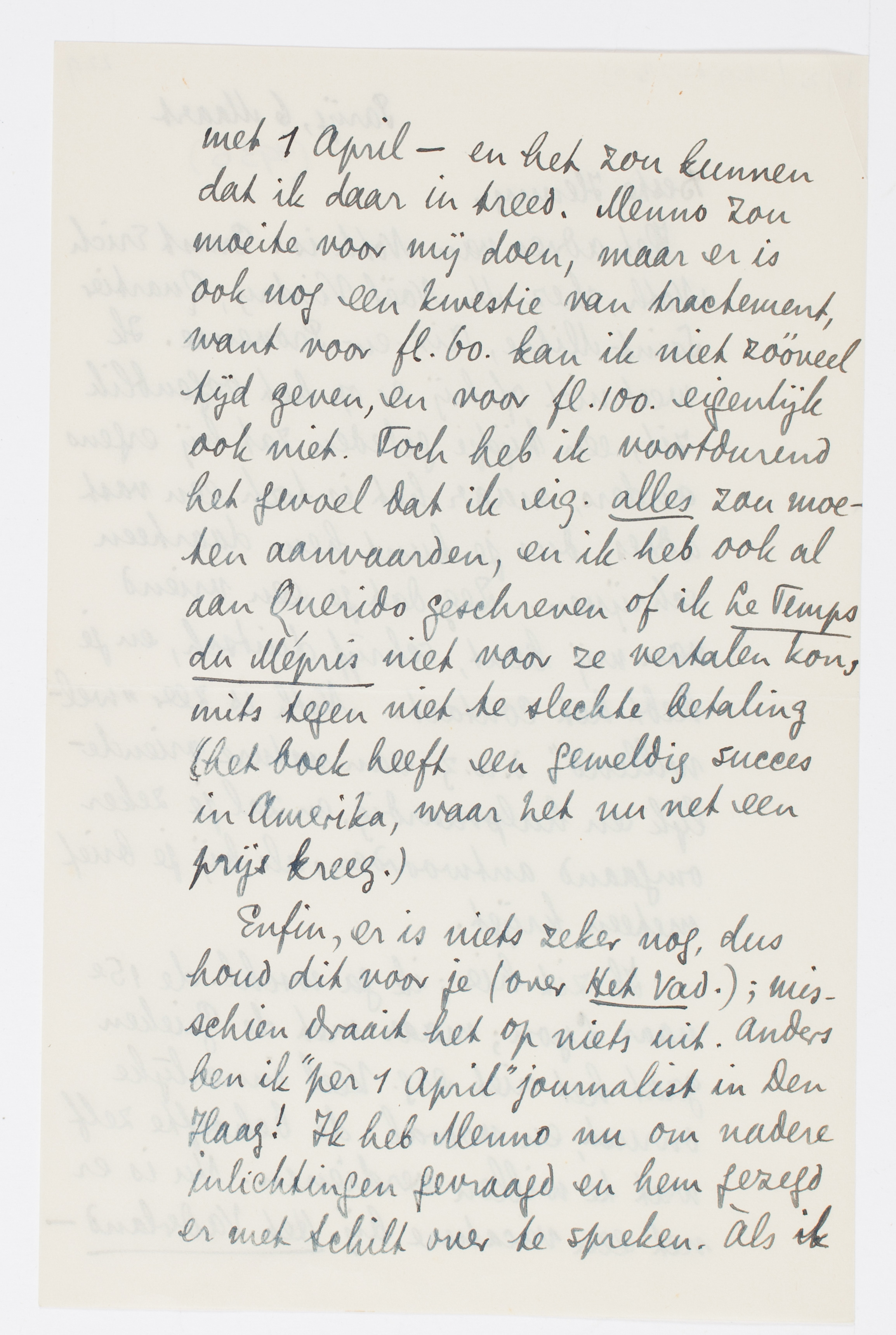 Ik zit hier; ik ga wschl. de 15e naar Lyon; maar met de Grieken gaat het niet erg. Veel innerlijke onrust, en vooral: de behoefte zelf wat te willen verdienen. Nu is er net een vacature bij Het Vaderland - met 1 April - en het zou kunnen dat ik daar in treed. Menno zou moeite voor mij doen, maar er is ook nog een kwestie van tractement, want voor fl. 60. kan ik niet zóóveel tijd geven, en voor fl 100. eigenlijk ook niet. Toch heb ik voortdurend het gevoel dat ik eig. alles zou moeten aanvaarden, en ik heb ook al aan Querido geschreven of ik Le Temps du Mépris niet voor ze vertalen kon, mits tegen niet te slechte betaling (het boek heeft een geweldig succes in Amerika, waar het nu net een prijs kreeg.)