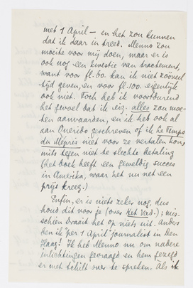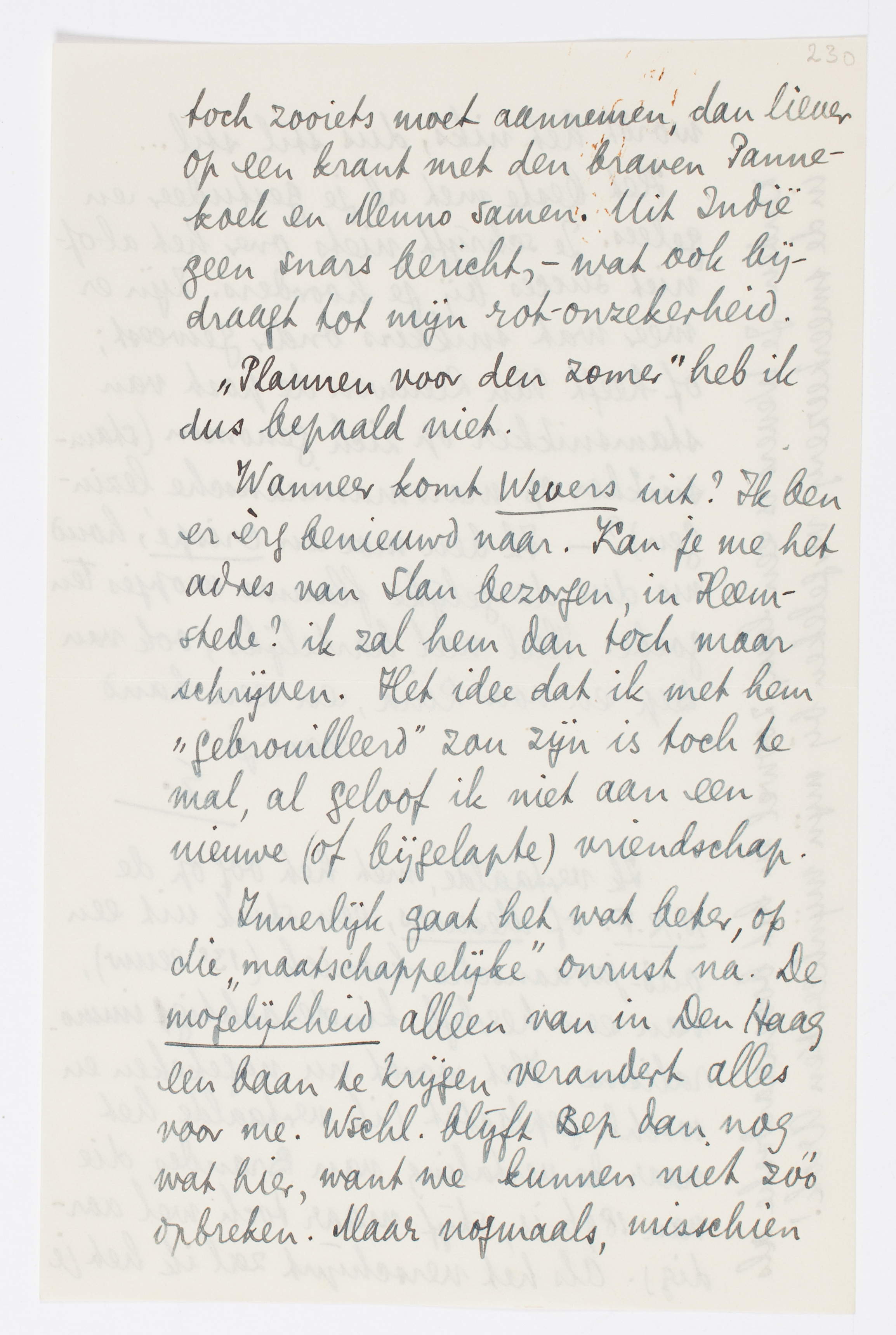 Enfin, er is niets zeker nog, dus houd dit voor je (over Het Vad.); misschien draait het op niets uit. Anders ben ik ‘per 1 April’ journalist in Den Haag! Ik heb Menno nu om nadere inlichtingen gevraagd en hem gezegd er met Schilt over te spreken.4091 Àls ik toch zooiets moet aannemen, dan liever op een krant met den braven Pannekoek en Menno samen. Uit Indië geen snars bericht, - wat ook bijdraagt tot mijn rot-onzekerheid.