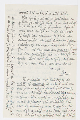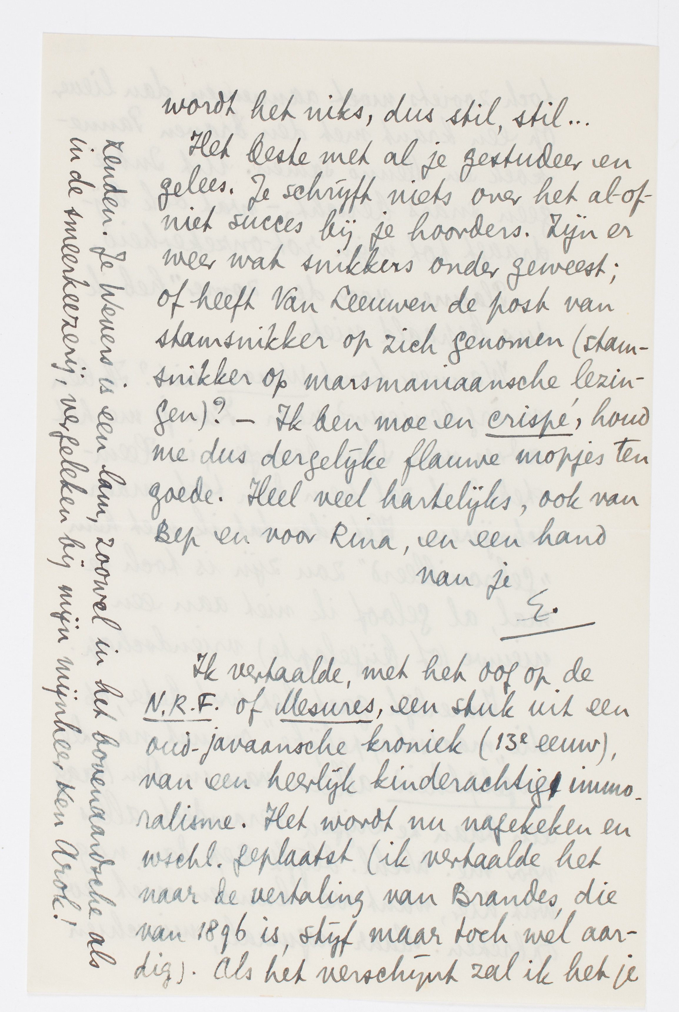 Ik vertaalde, met het oog op de N.R.F. of Mesures, een stuk uit een oud-javaansche kroniek (13e eeuw), van een heerlijk kinderachtig immoralisme. Het wordt nu nagekeken en wschl. geplaatst (ik vertaalde het naar de vertaling van Brandes, die van 1896 is,4093 stijf maar toch wel aardig). Als het verschijnt zal ik het je zenden. Je Wevers is een lam, zoowel in het bovenaardsche als in de smeerkeezerij, vergeleken bij mijn mijnheer Ken Arok!