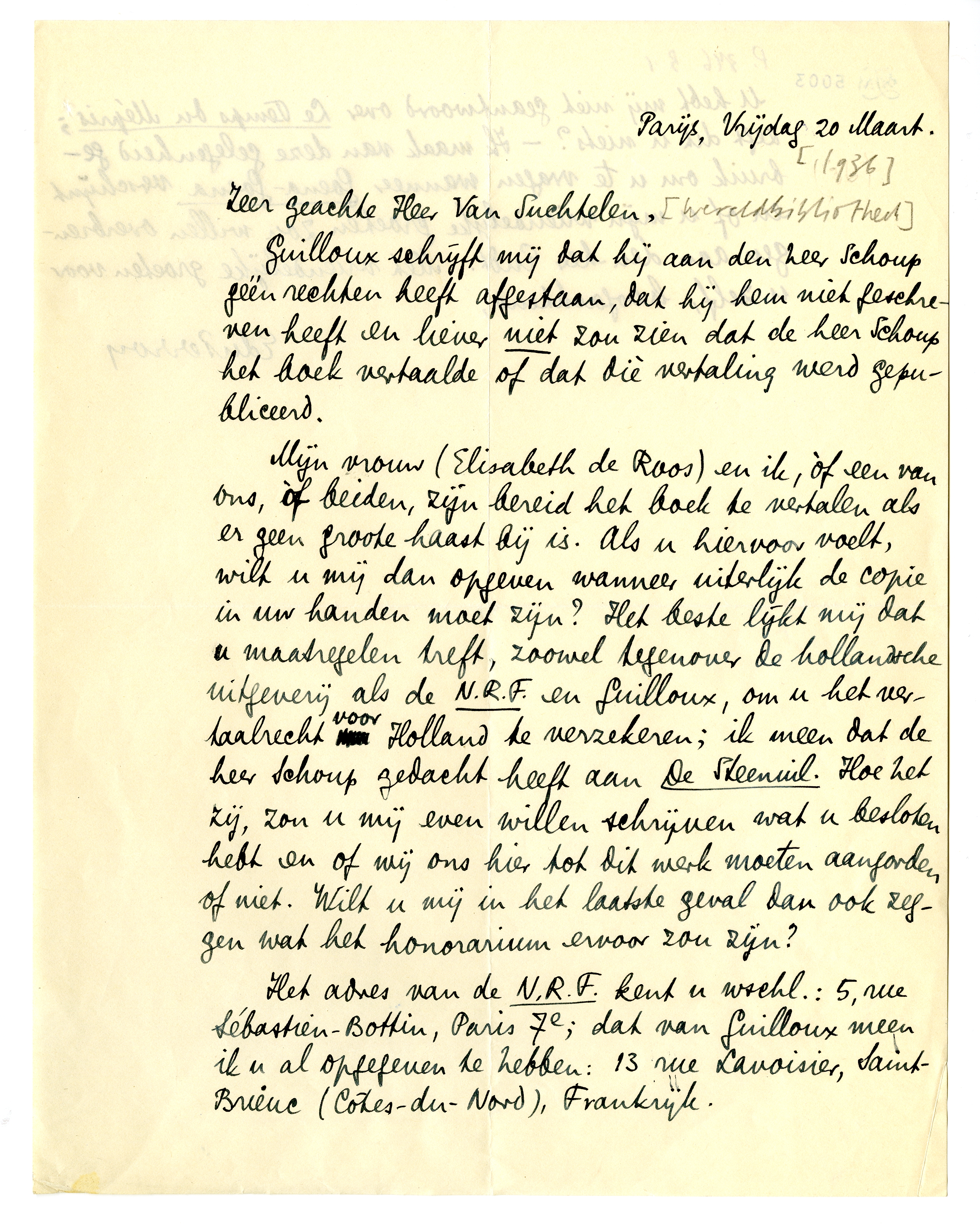 Mijn vrouw (Elisabeth de Roos) en ik, òf een van ons, òf beiden, zijn bereid het boek te vertalen als er geen groote haast bij is. Als u hiervoor voelt, wilt u mij dan opgeven wanneer uiterlijk de copie in uw handen moet zijn? Het beste lijkt mij dat u maatregelen treft, zoowel tegenover de hollandsche uitgeverij als de N.R.F. en Guilloux, om u het vertaalrecht voor Holland te verzekeren; ik meen dat de heer Schoup gedacht heeft aan De Steenuil. Hoe het zij, zou u mij even willen schrijven wat u besloten hebt en of wij ons hier tot dit werk moeten aangorden of niet. Wilt u mij in het laatste geval dan ook zeggen wat het honorarium ervoor zou zijn?