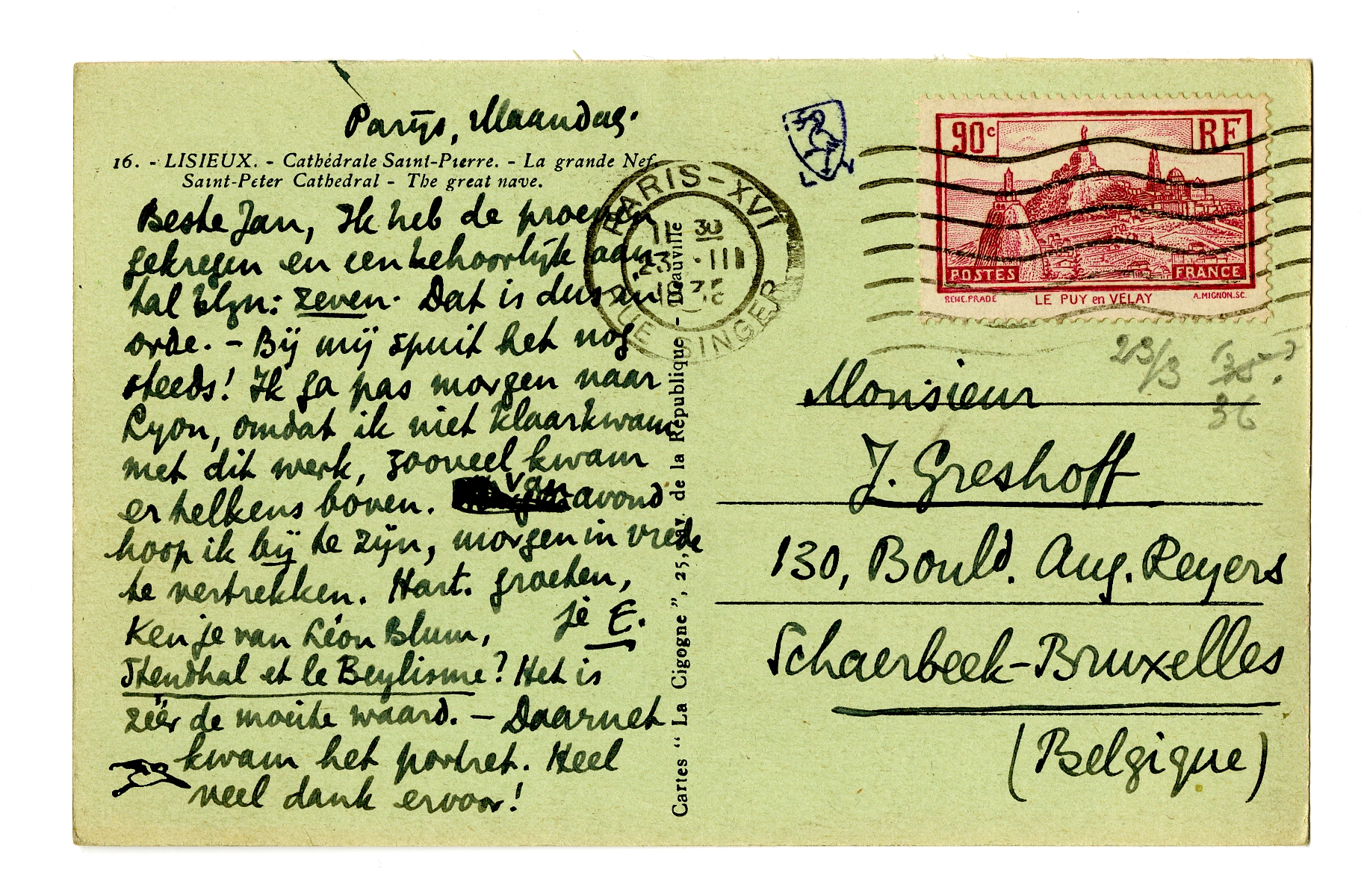 Beste Jan, Ik heb de proeven gekregen en een behoorlijk aantal blzn: zeven. Dat is dus in orde. - Bij mij spuit het nog steeds! Ik ga pas morgen naar Lyon, omdat ik niet klaarkwam met dit werk, zooveel kwam er telkens boven. Vanavond hoop ik bij te zijn, morgen in vrede te vertrekken. Hart. groeten,