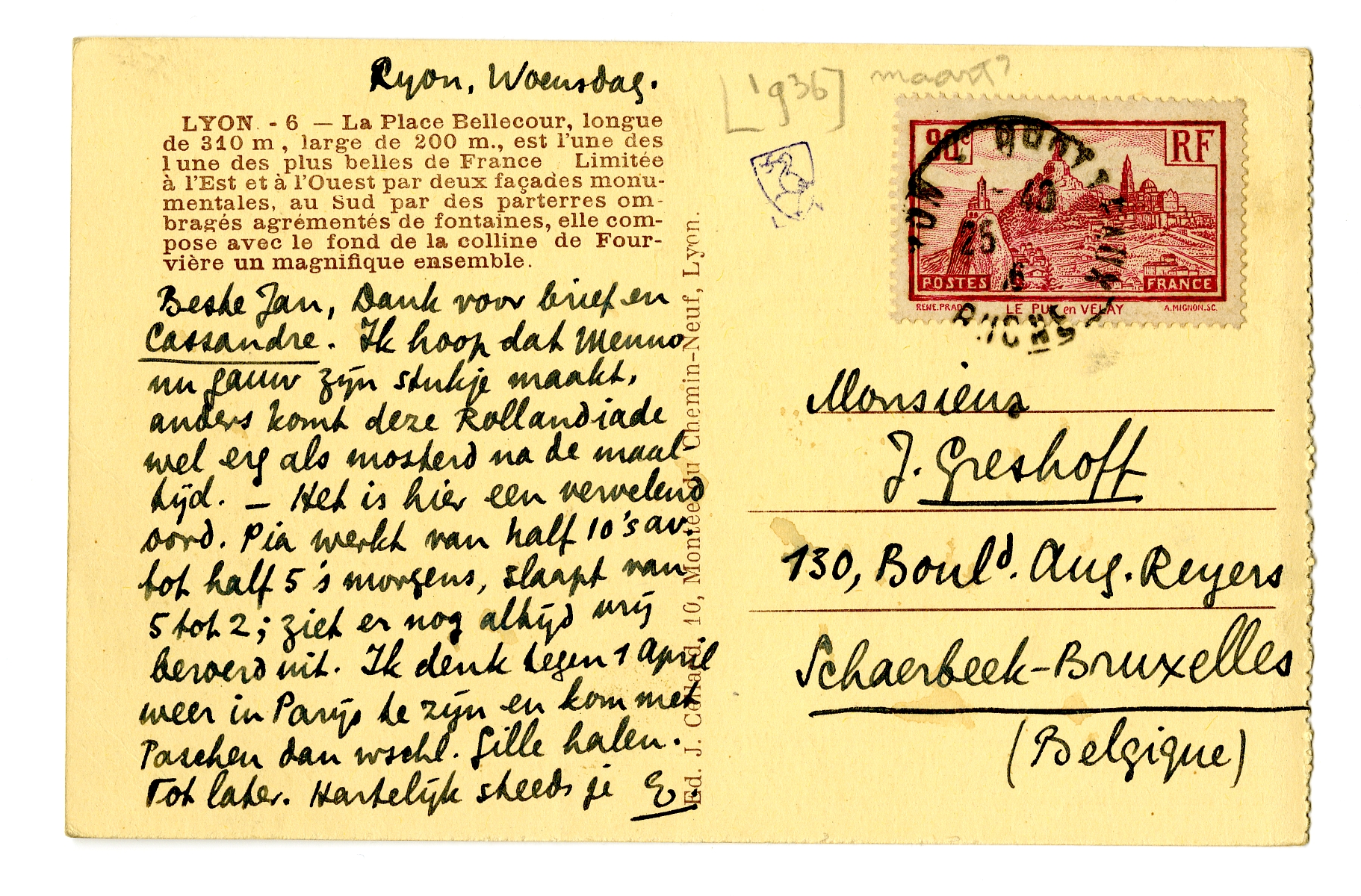 Beste Jan, Dank voor brief en Cassandre.4118 Ik hoop dat Menno nu gauw zijn stukje maakt, anders komt deze Rollandiade wel erg als mosterd na de maaltijd. - Het is hier een vervelend oord. Pia werkt van half 10 's av. tot half 5 's morgens, slaapt van 5 tot 2; ziet er nog altijd vrij beroerd uit. Ik denk tegen 1 April weer in Parijs te zijn en kom met Paschen dan wschl. Gille halen.