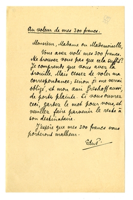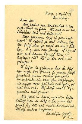 Ik begin te gelooven dat de dief van mijn 300 francs je naam heeft genoteerd en nu verdere parijsche correspondentie voor jou weghoudt, uit angst voor politiemaatregelen of wat dan ook. Hij heeft wschl. ‘zijn geweten niet gerust’.