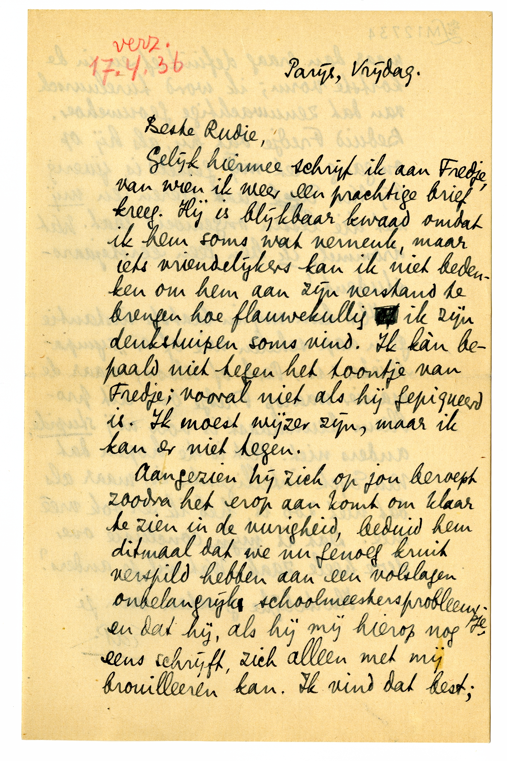 Aangezien hij zich op jou beroept zoodra het erop aan komt om klaar te zien in de vurigheid, beduid hem ditmaal dat we nu genoeg kruit verspild hebben aan een volslagen onbelangrijk schoolmeestersprobleempje, en dat hij, als hij mij hierop nog eens schrijft, zich alleen met mij brouilleeren kan. Ik vind dat best; maar dan graag definitief en in de kortste vorm; ik word tureluursch van dat zenuwachtige geouwehoer. Beduid Fredje dat hij, als hij op omgang met mij gesteld is, ijverig bij Van Eyck gaat leeren en mij met die lessen ongemoeid laat. Wat drommel, ik ben geen eerstejaarsstudent!