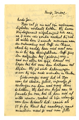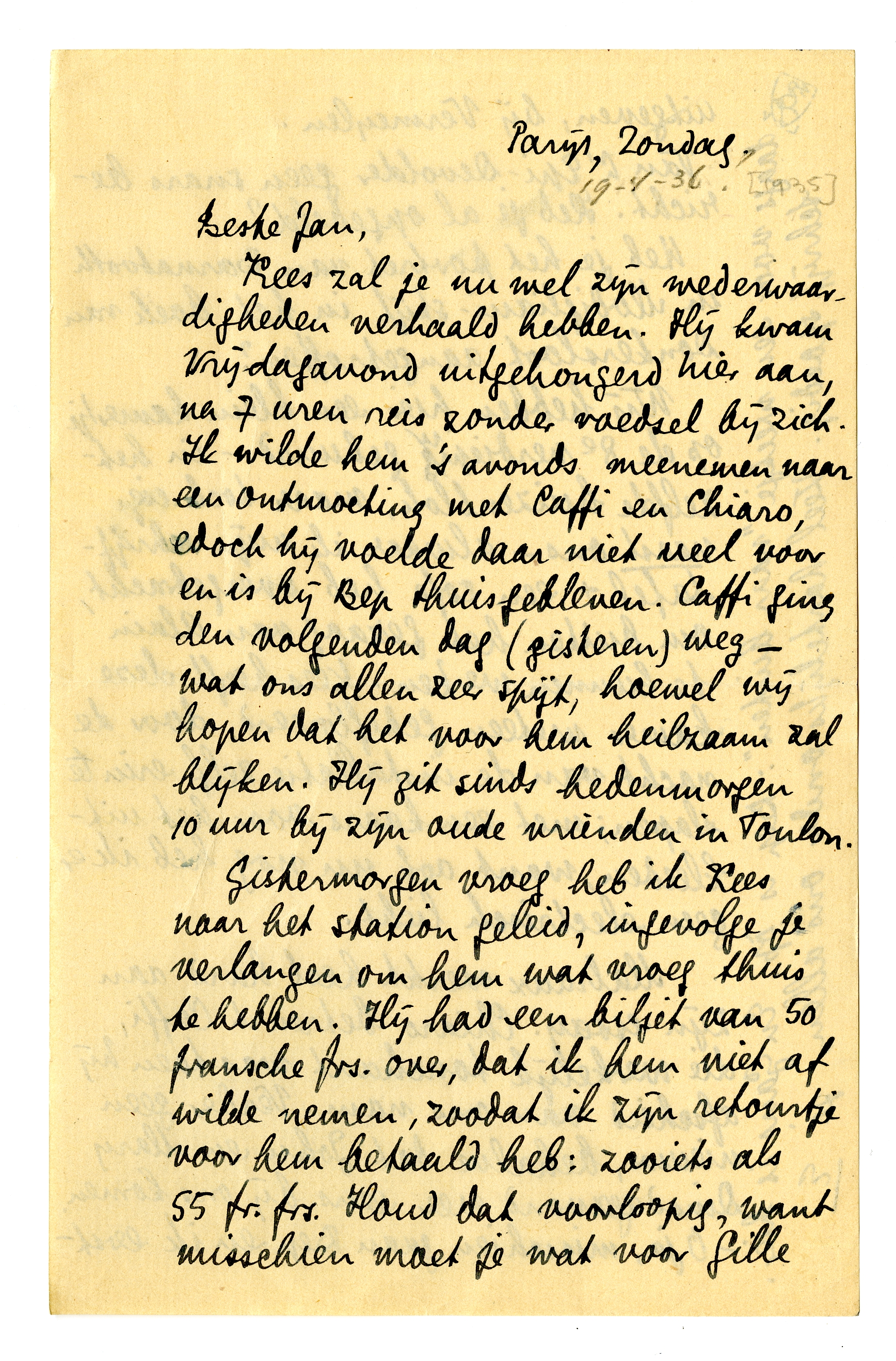 Gistermorgen vroeg heb ik Kees naar het station geleid, ingevolge je verlangen om hem wat vroeg thuis te hebben. Hij had een biljet van 50 fransche frs. over, dat ik hem niet af wilde nemen, zoodat ik zijn retourtje voor hem betaald heb: zooiets als 55 fr. frs. Houd dat voorloopig, want misschien moet je wat voor Gille uitgeven, bij Vermeylen.