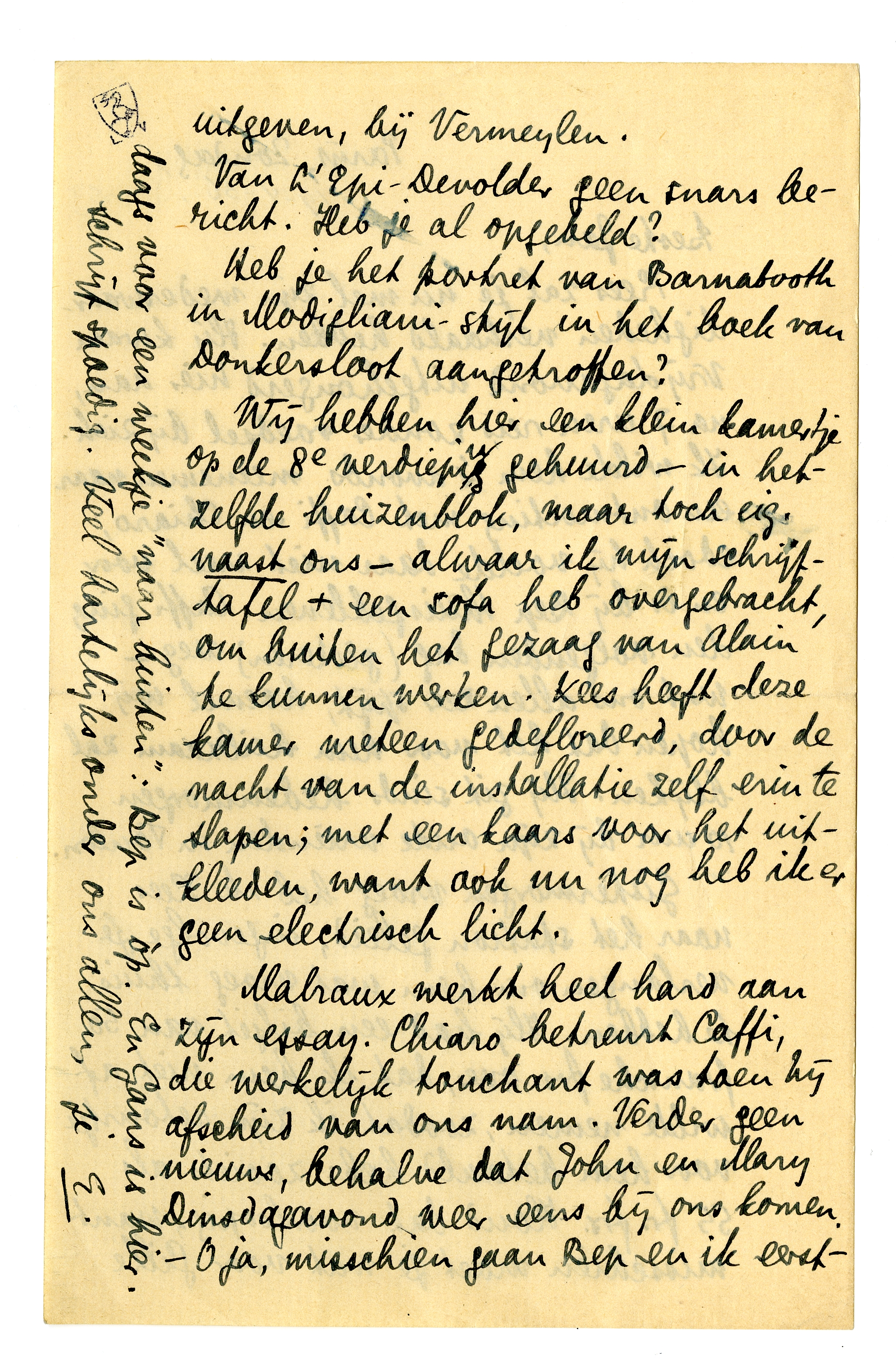 Wij hebben hier een klein kamertje op de 8e verdieping gehuurd - in hetzelfde huizenblok, maar toch eig. naast ons - alwaar ik mijn schrijftafel + een sofa heb overgebracht, om buiten het gezaag van Alain te kunnen werken. Kees heeft deze kamer meteen gedefloreerd, door de nacht van de installatie zelf erin te slapen; met een kaars voor het uitkleeden, want ook nu nog heb ik er geen electrisch licht.